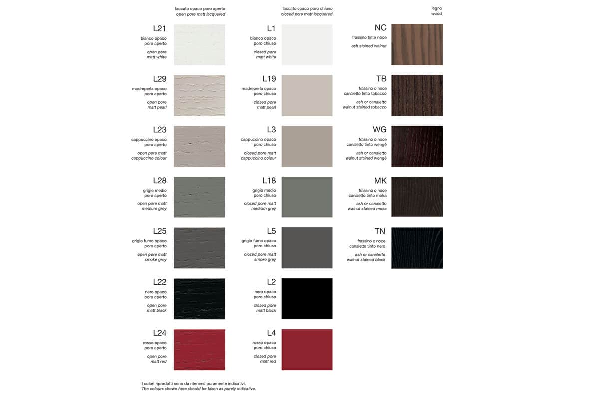 On request, it is available in many other finishings as wengé, walnut, tobacco, Moka as well as several lacquered colours.