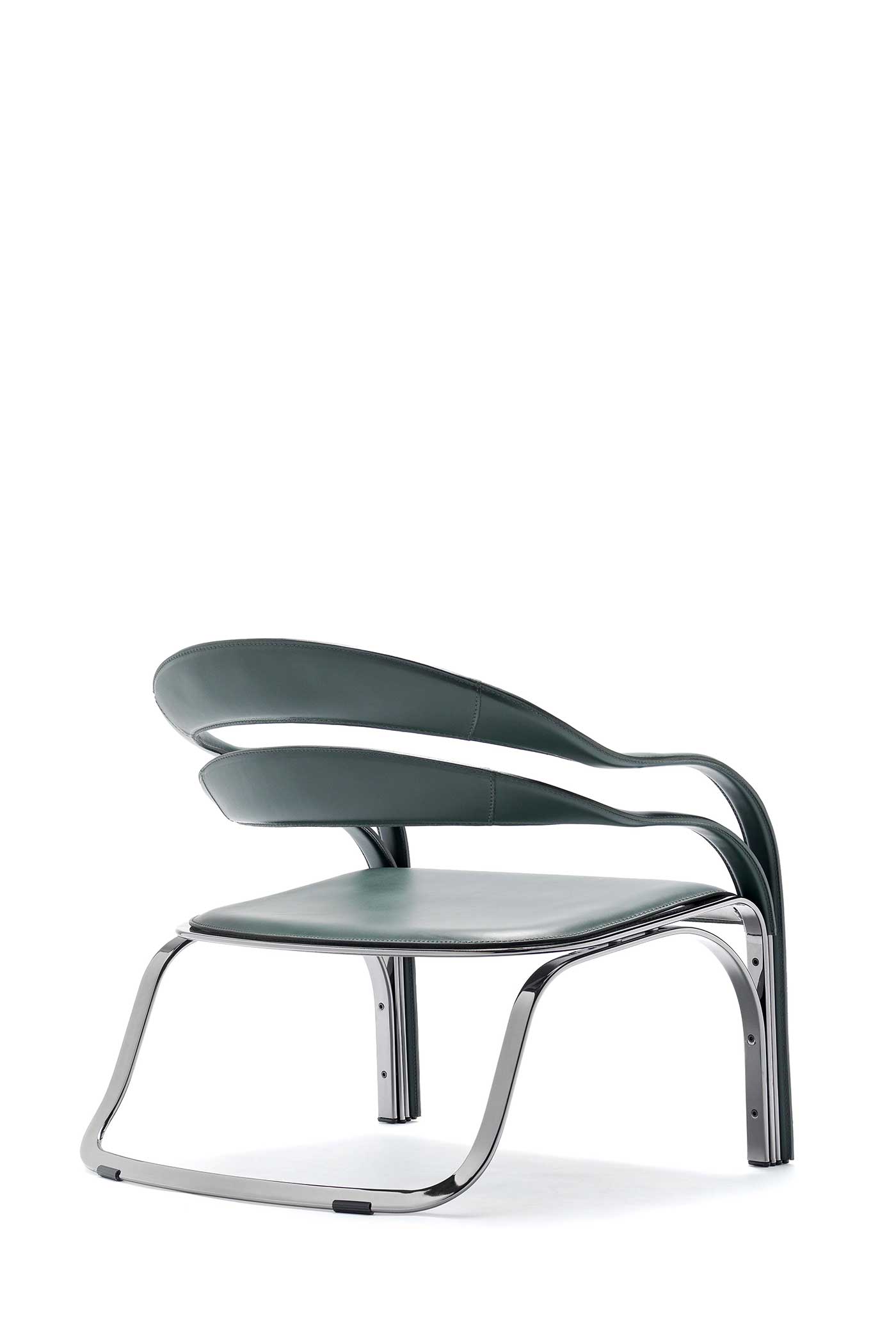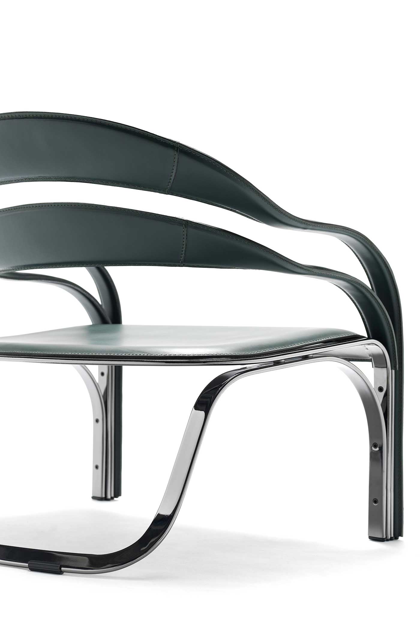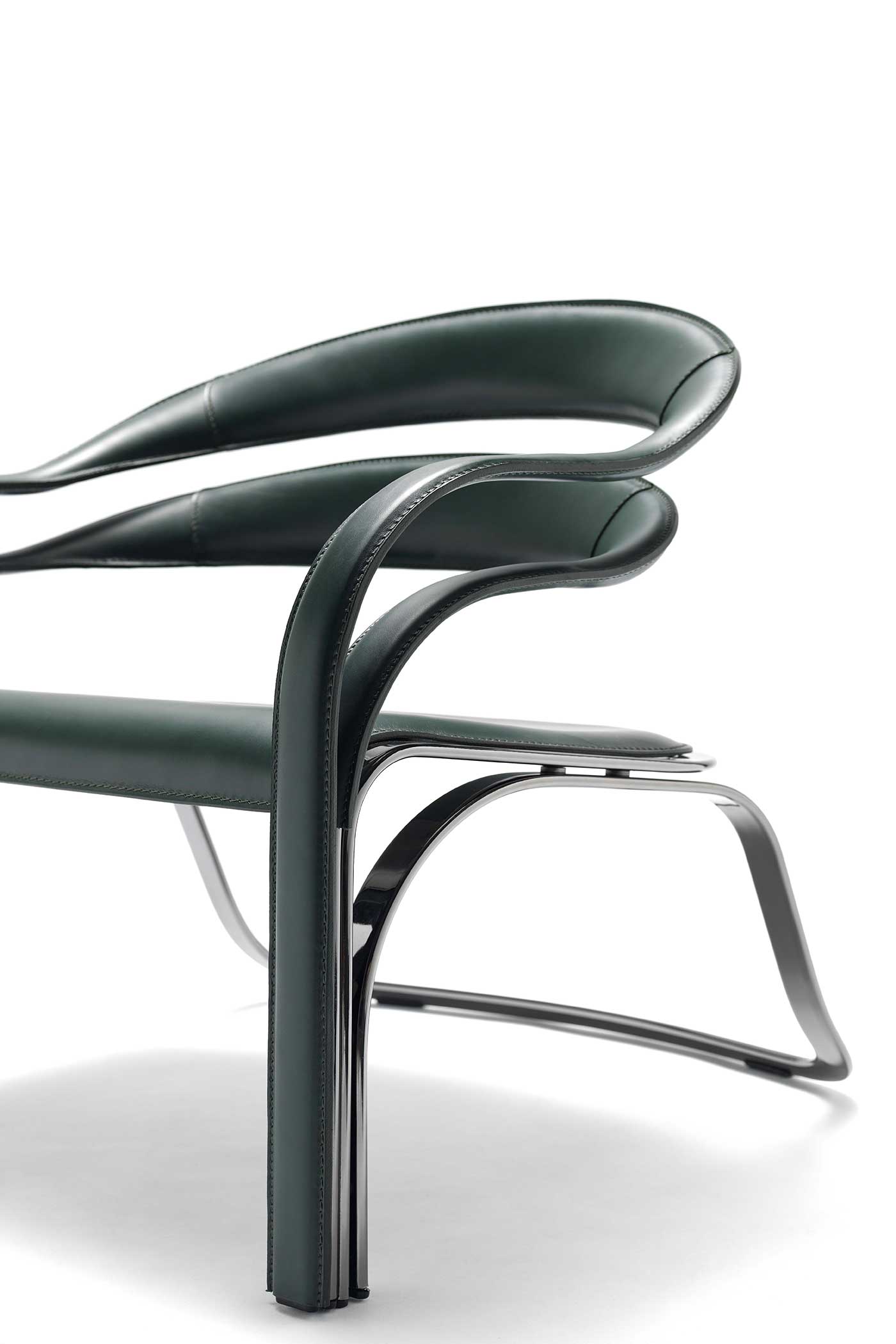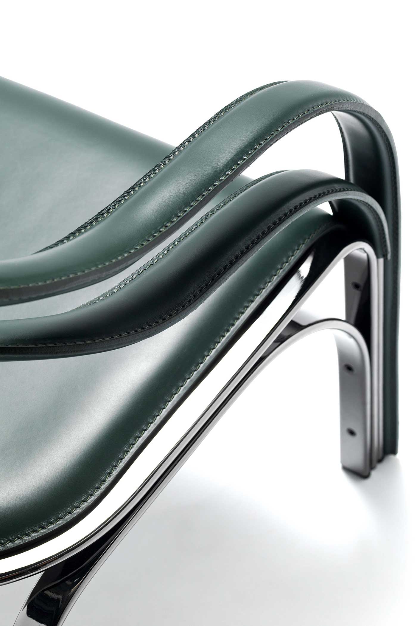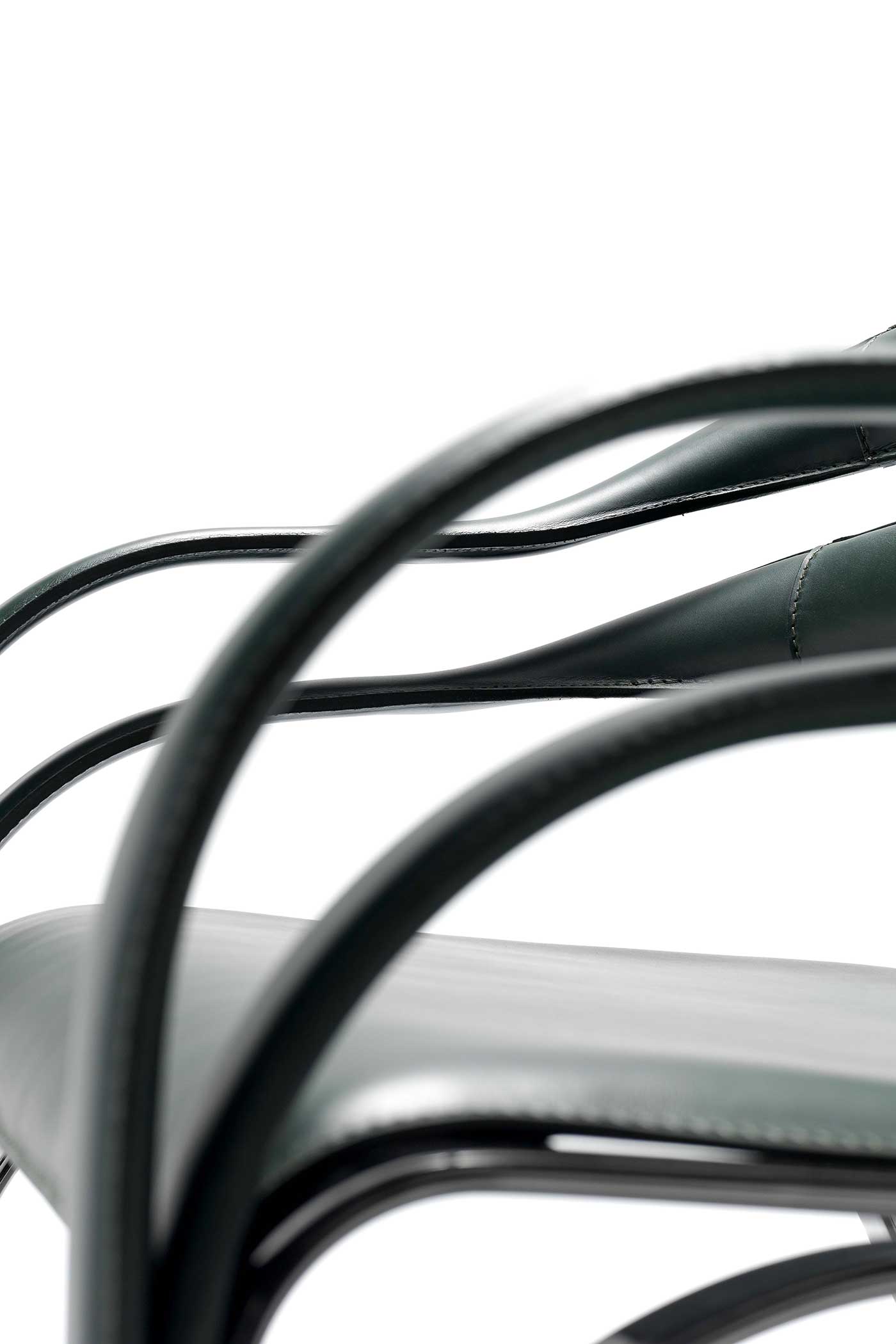 The armchair visible in the photos has a steel structure with galvanic treatment in the “444 Black Nickel” finish and is covered in “30 English green” full-grain leather.