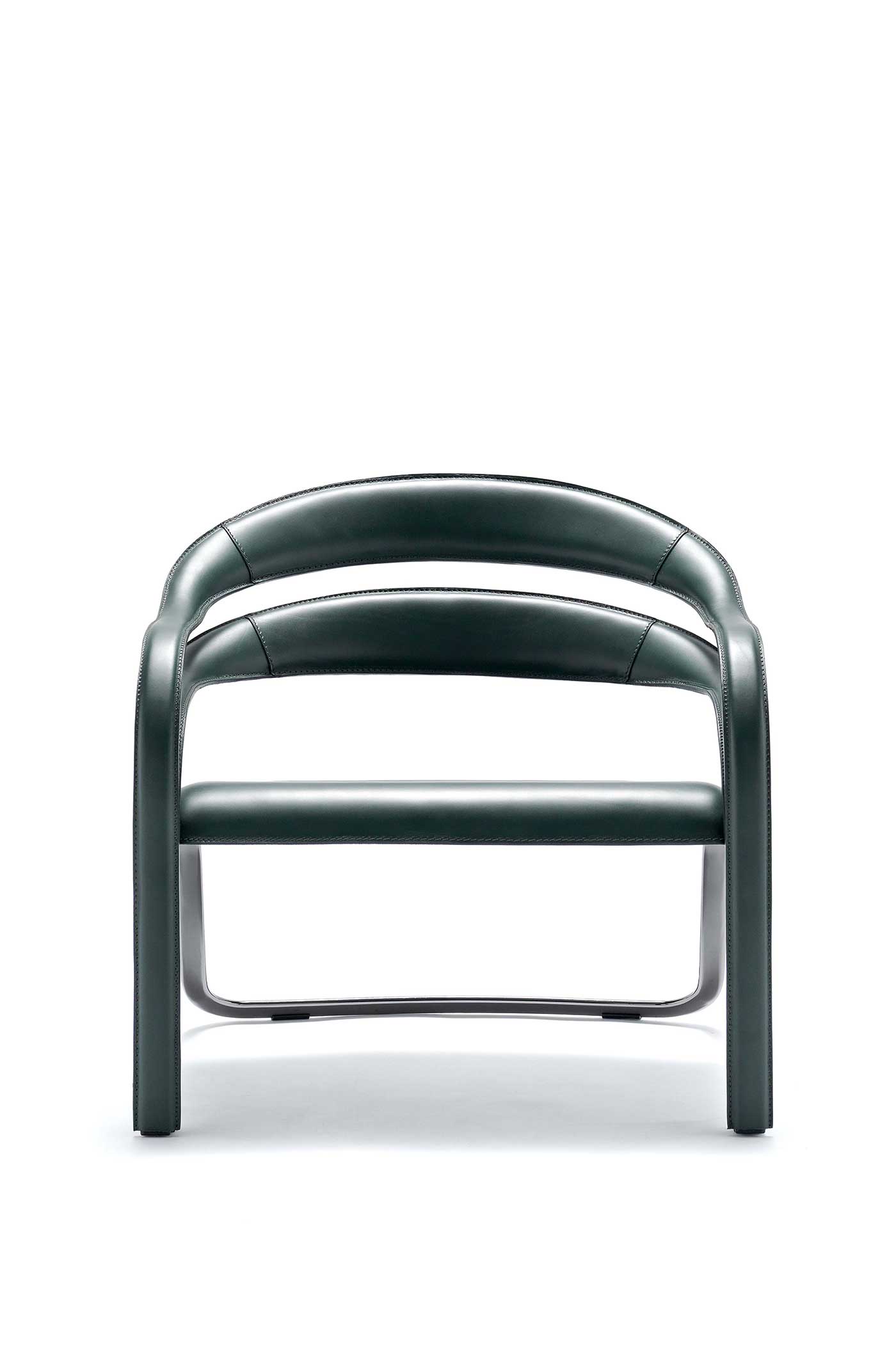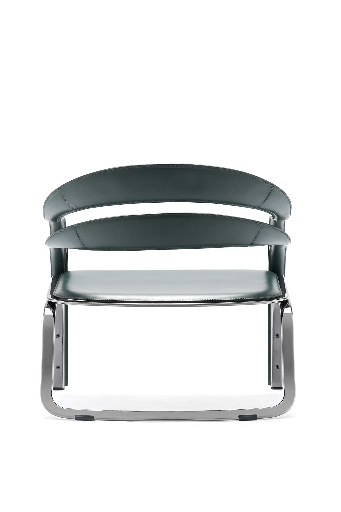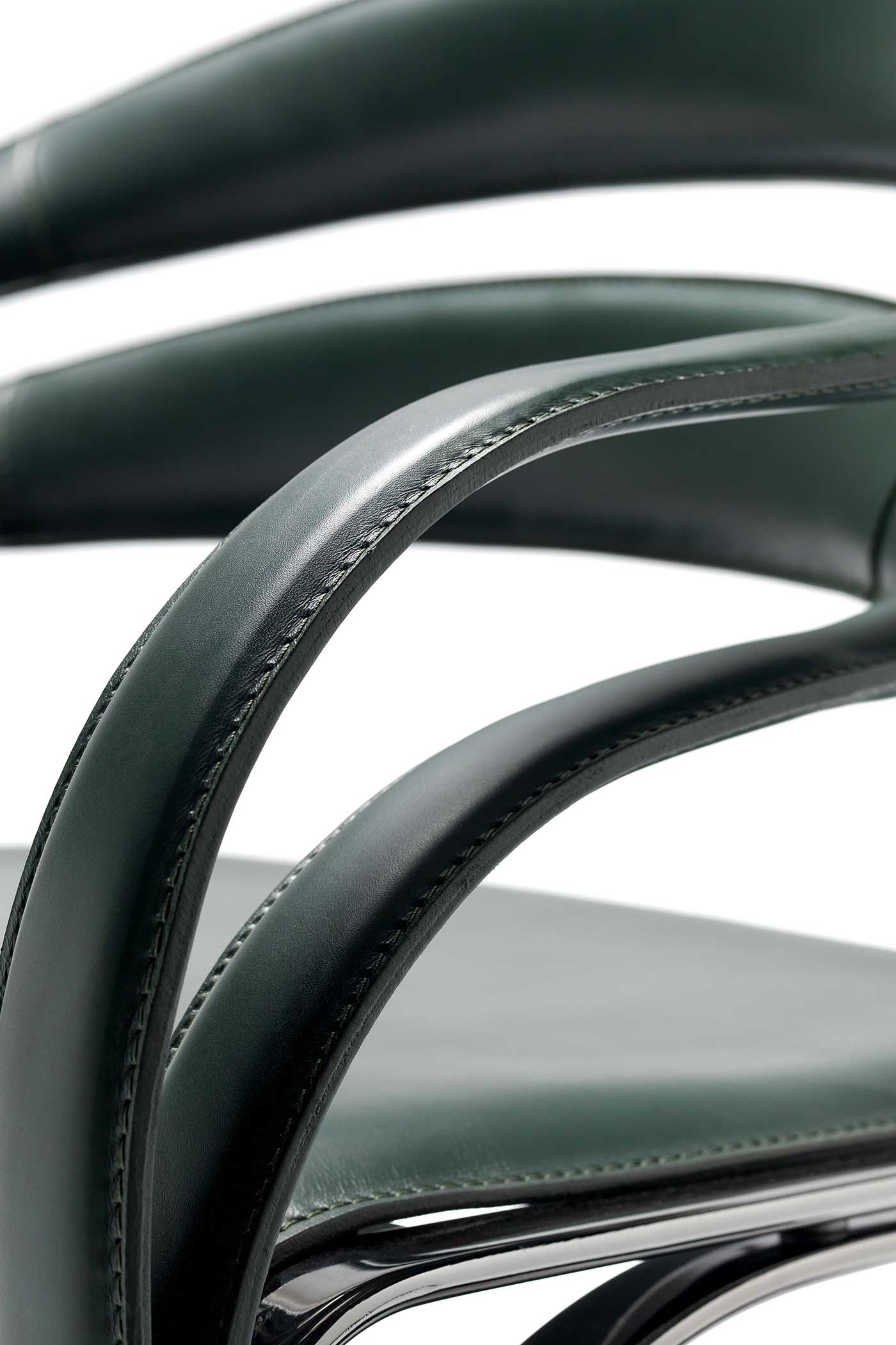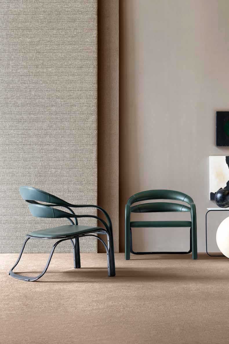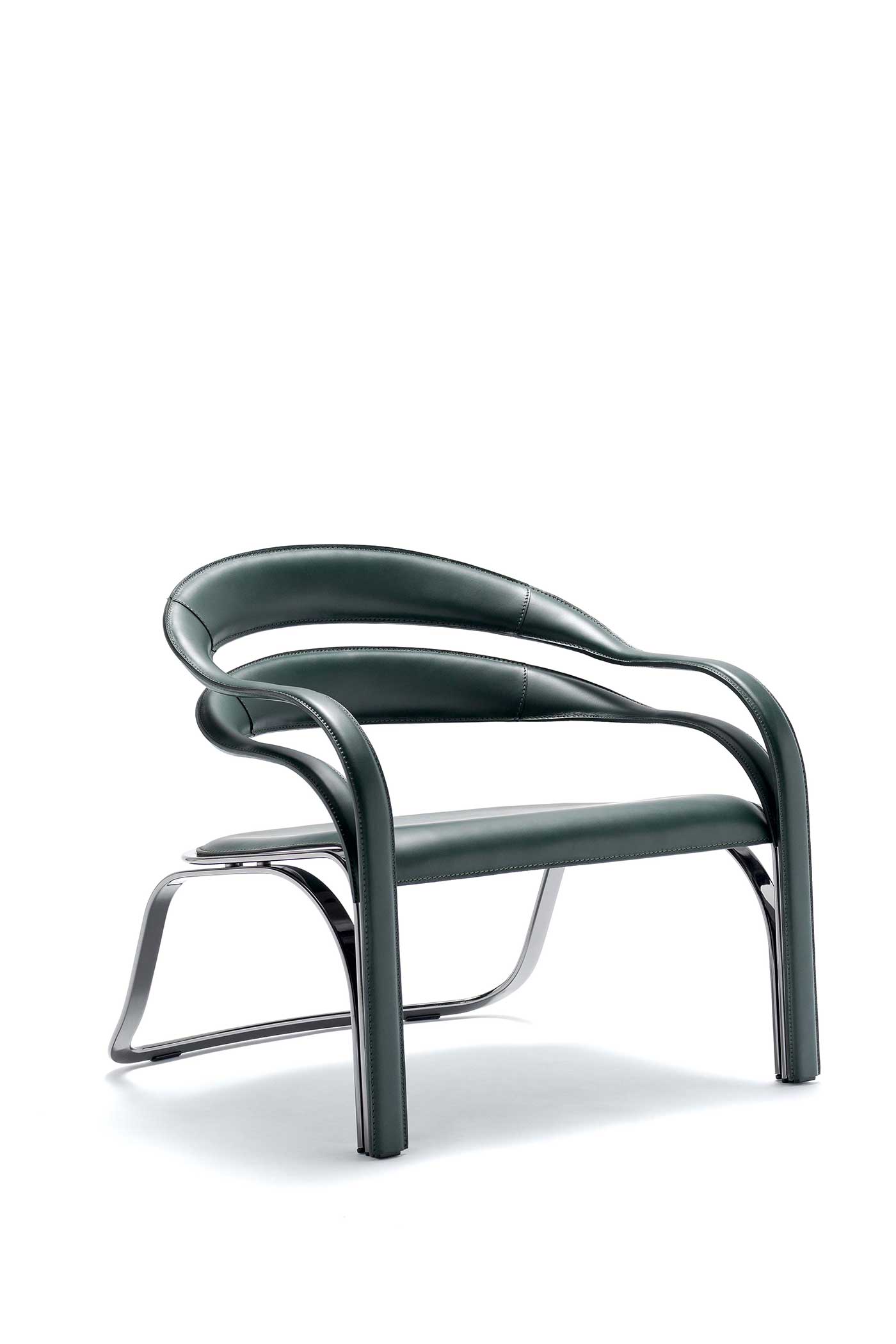 The armchair visible in the photos has a steel structure with galvanic treatment in the “444 Black Nickel” finish and is covered in “30 English green” full-grain leather.