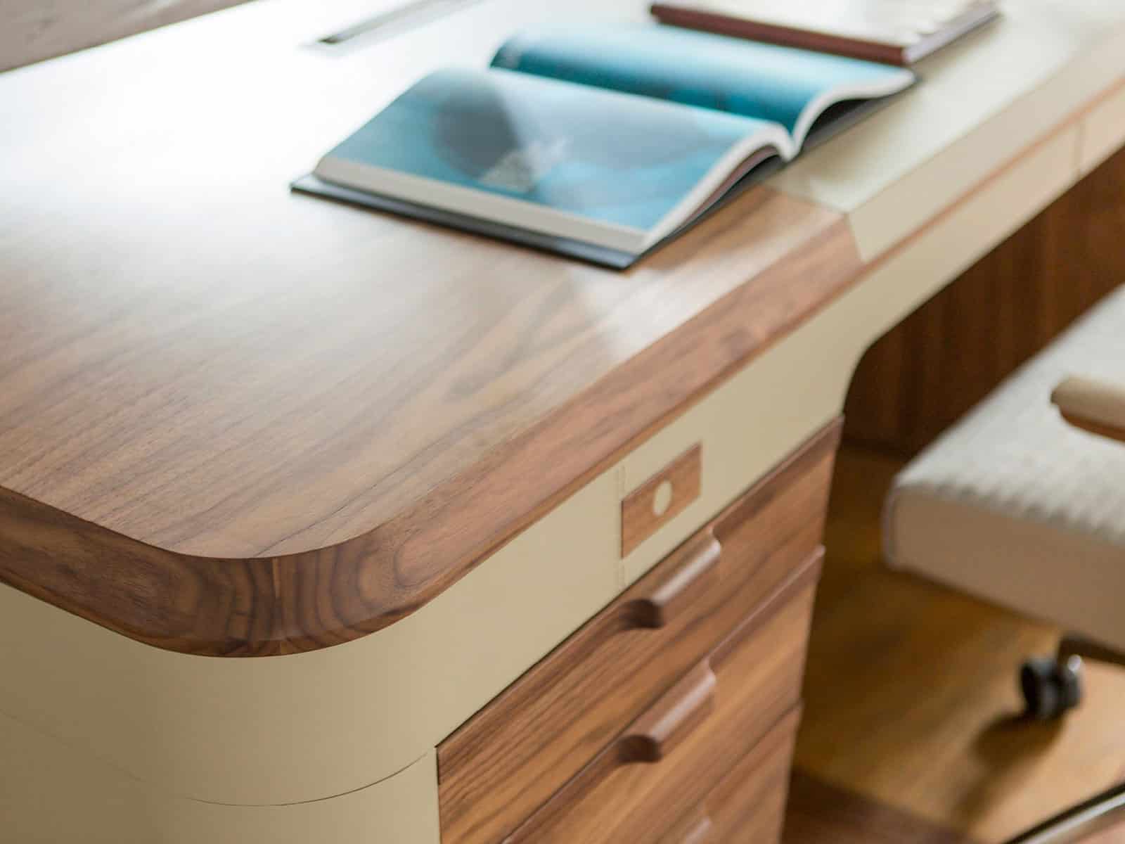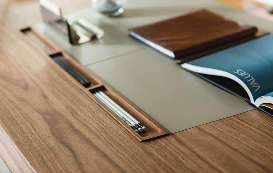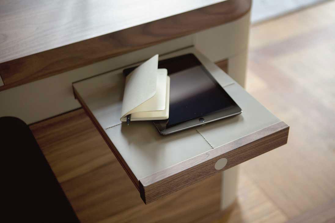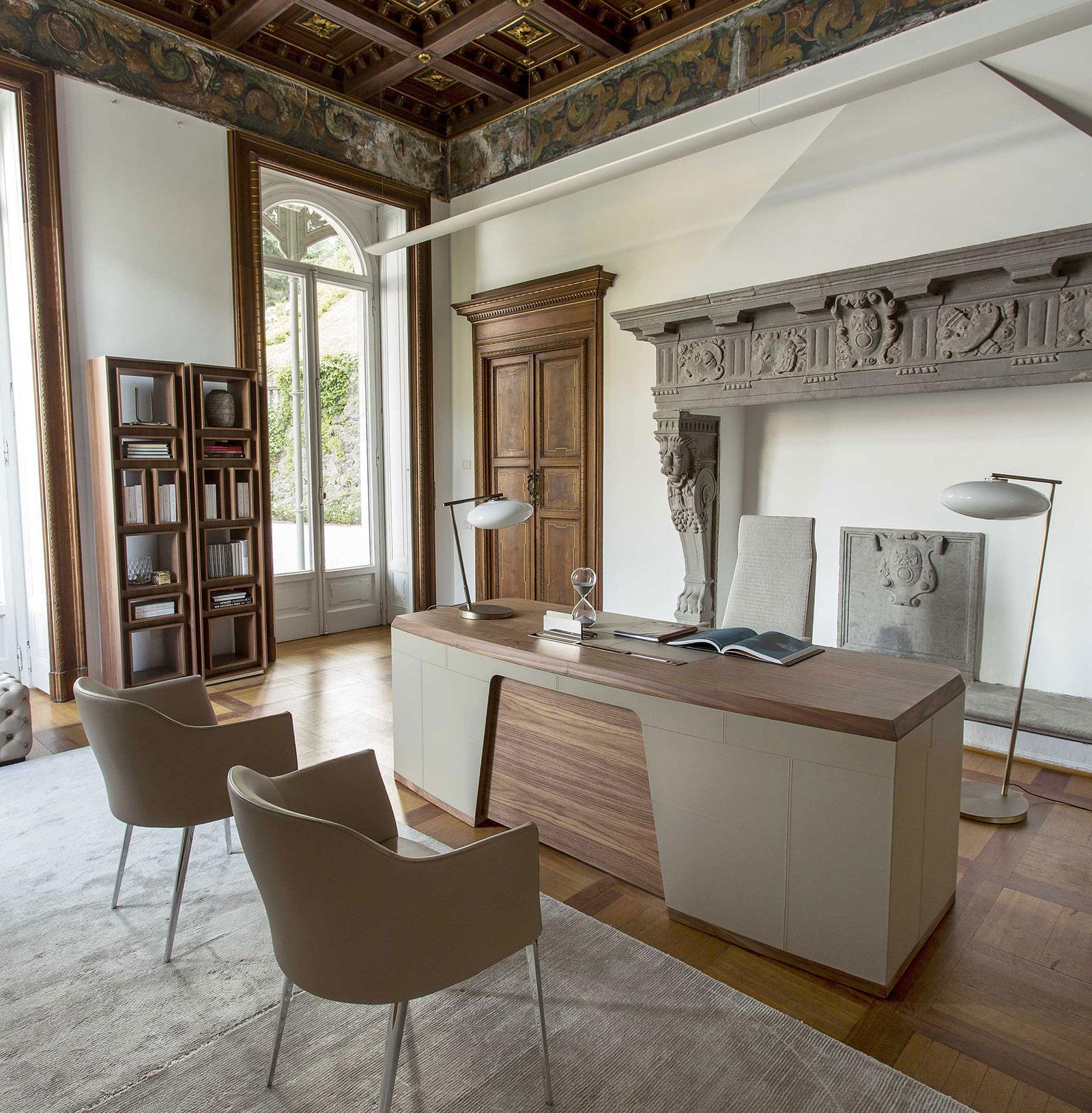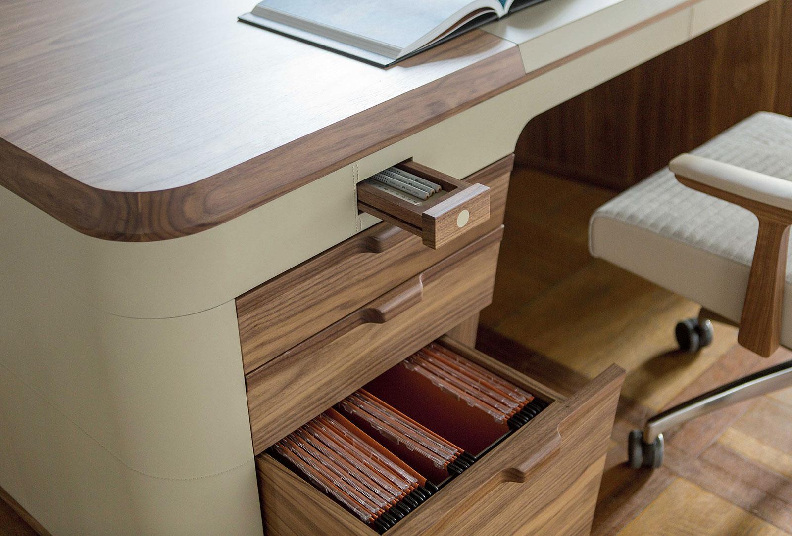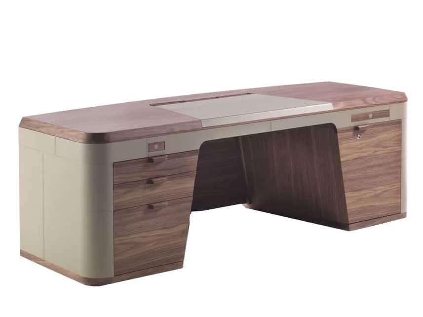 A luxurious and intimate object, Flavio writing desk is enriched by the use of fine wood and leatherette for covering and for top.