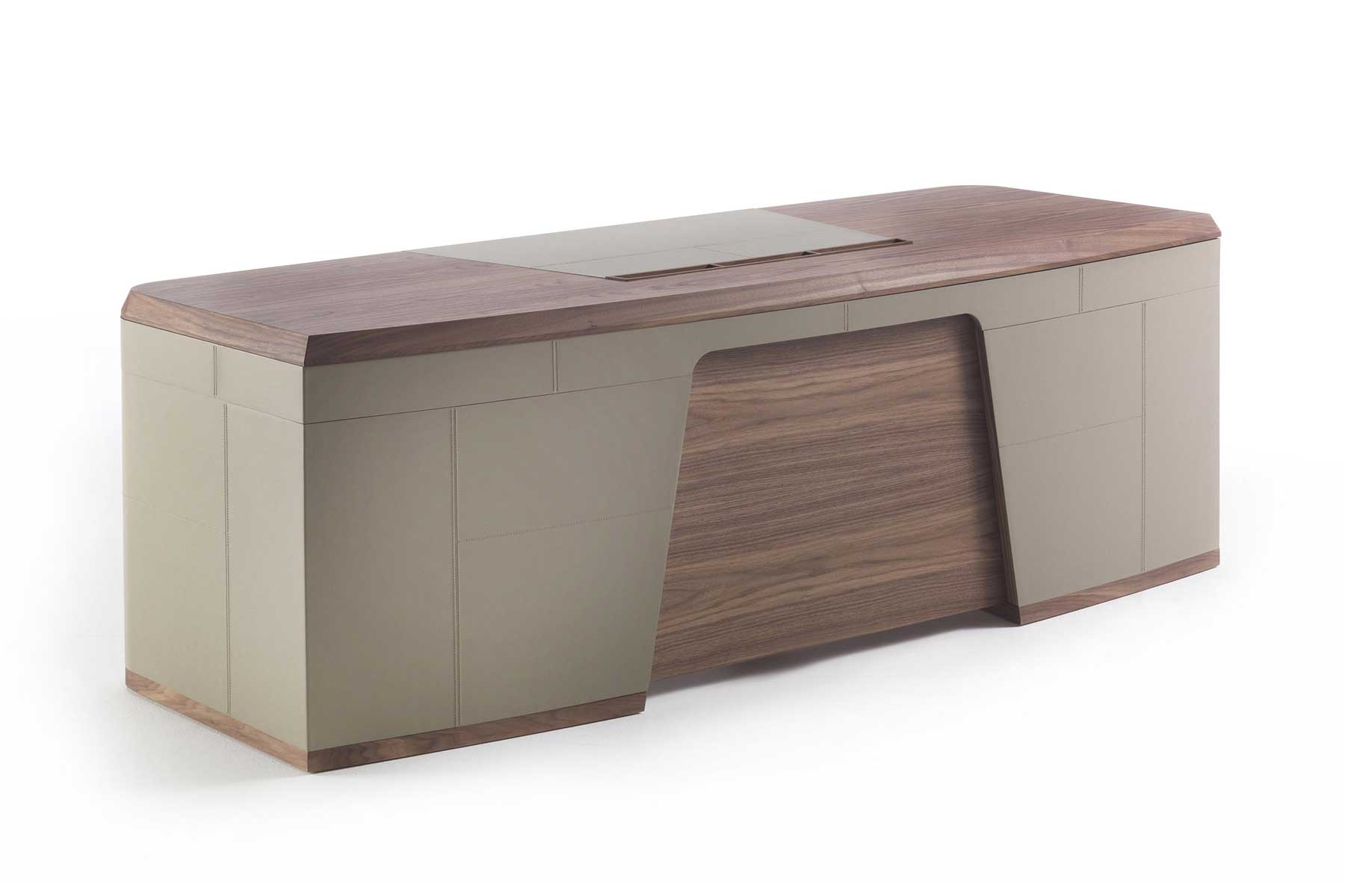 Executive writing desk in Canaletto walnut with outside frame covered by cuoietto leather and inside frame in wood.