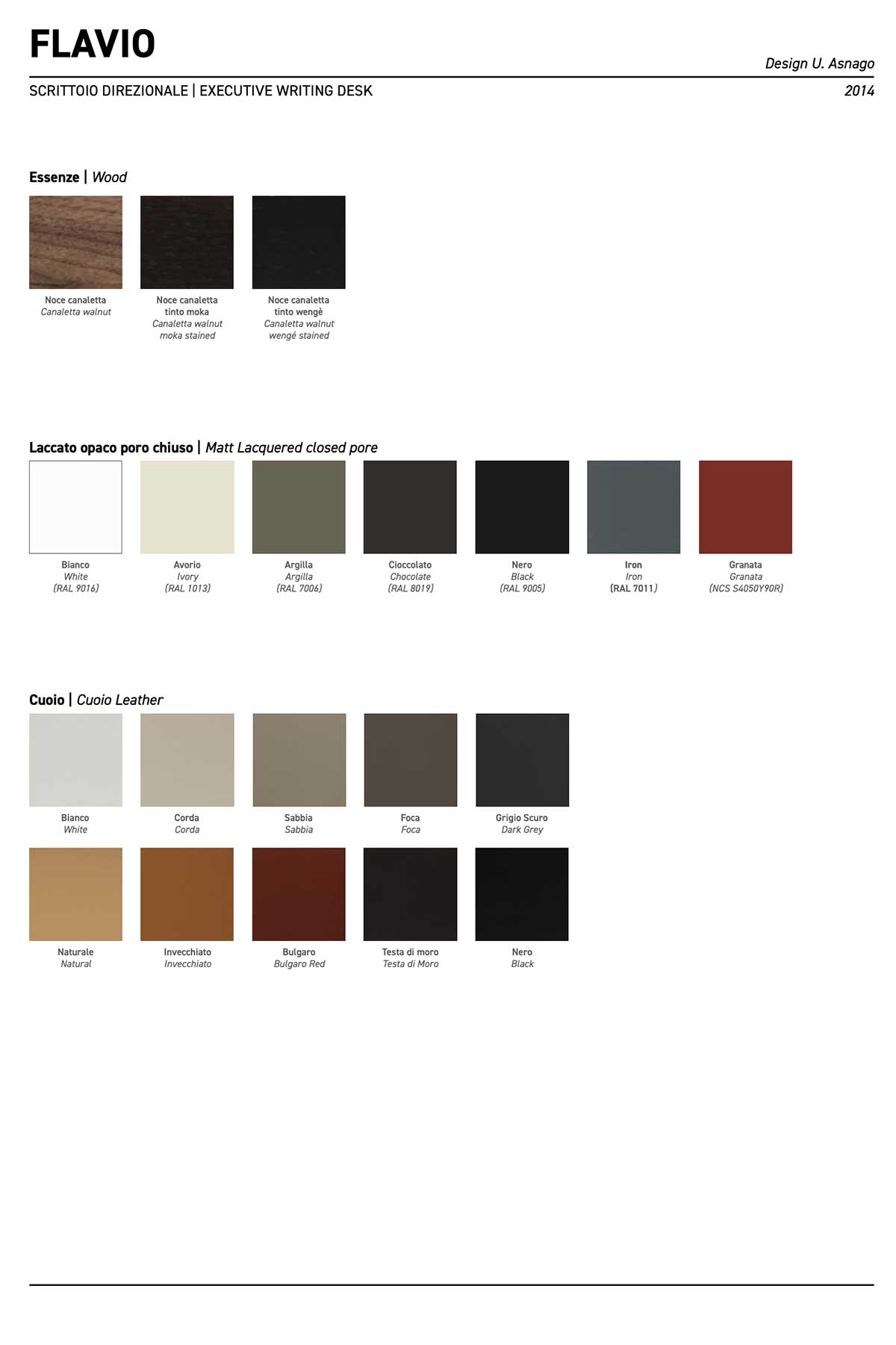Walnut Canaletto wood can be stained natural as in the picture, mocha or wengé, or can be matt lacquered closed pore in different available RAL colours.