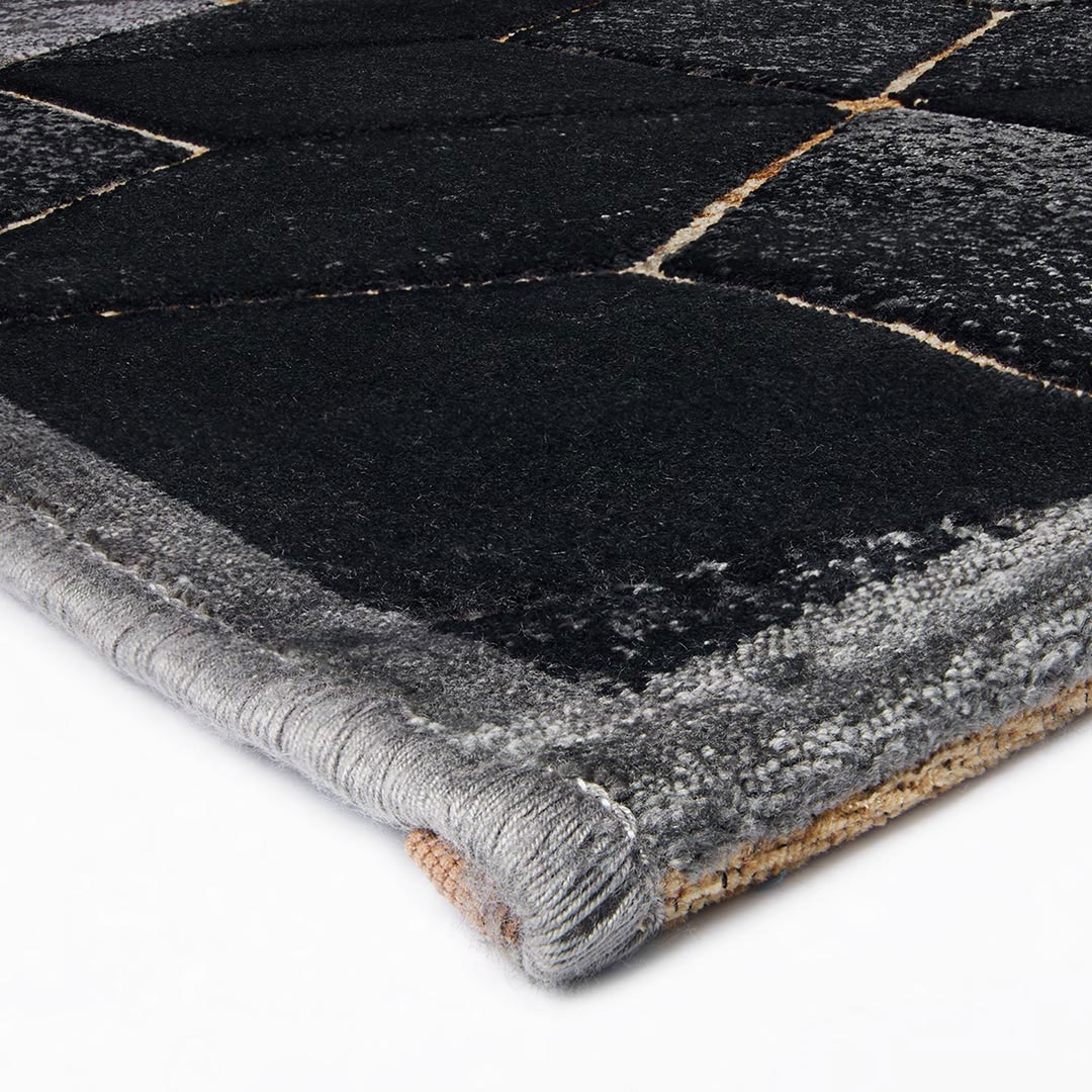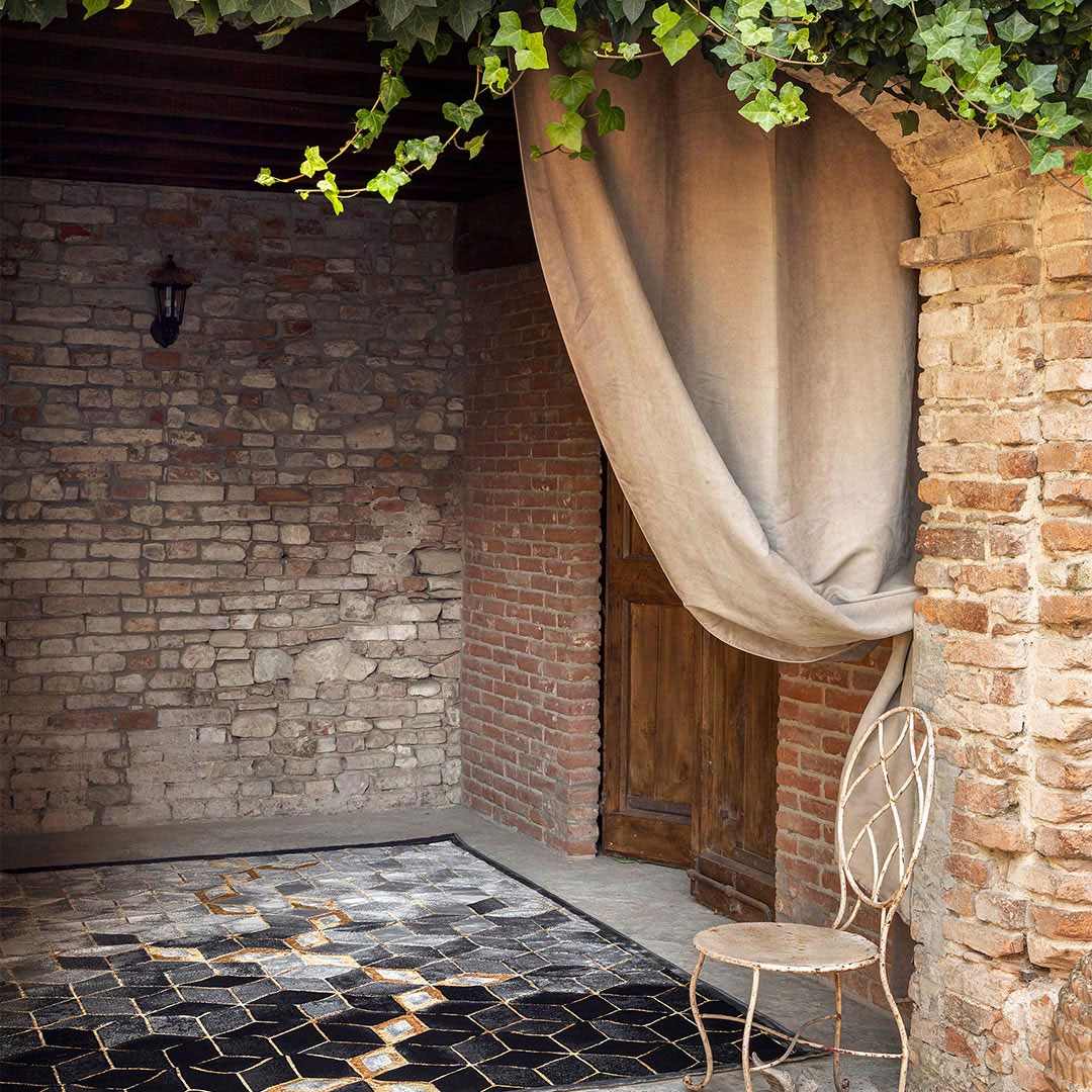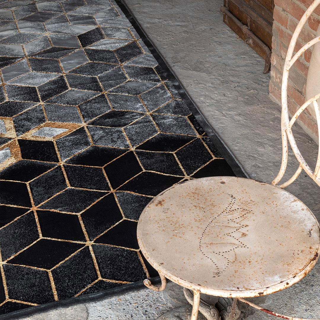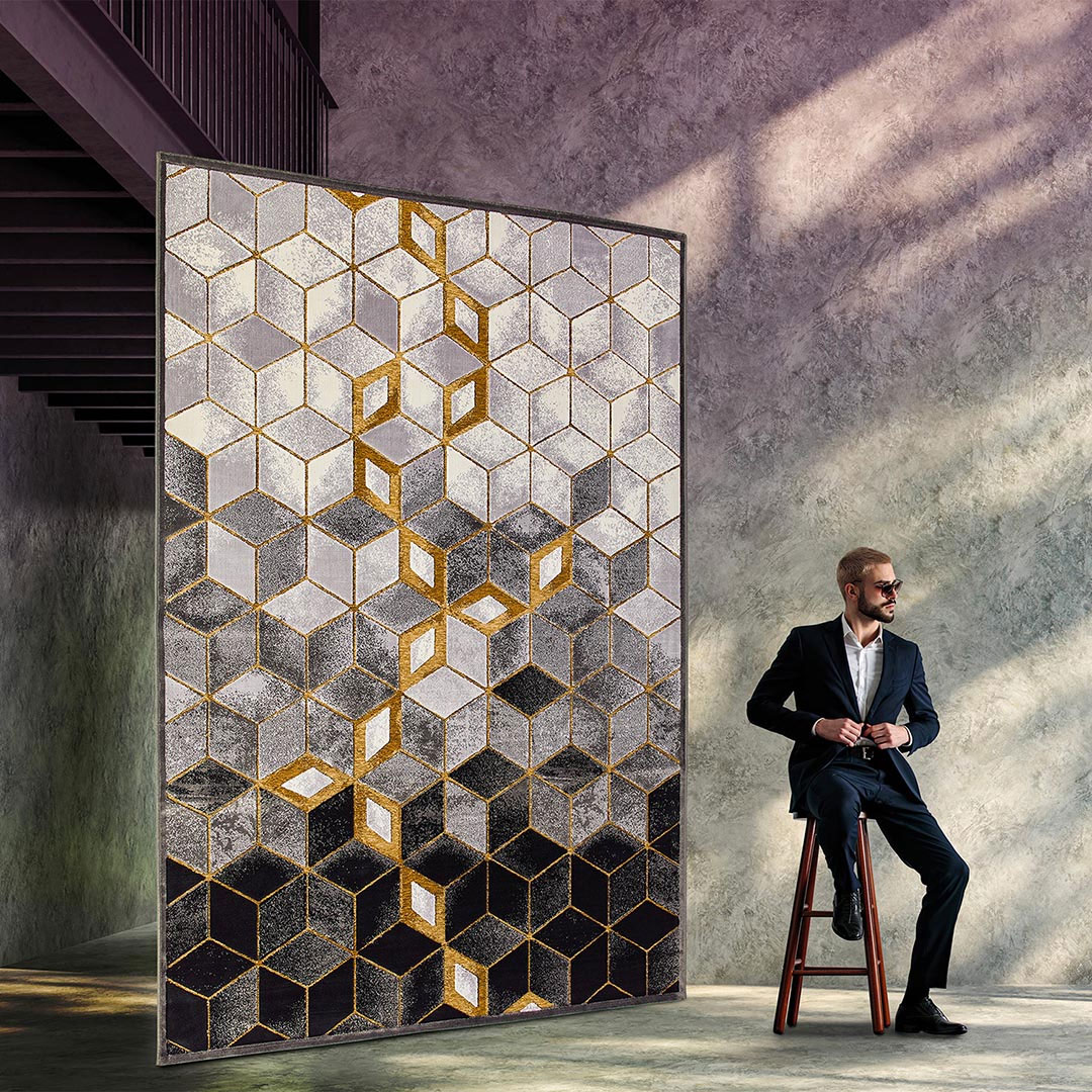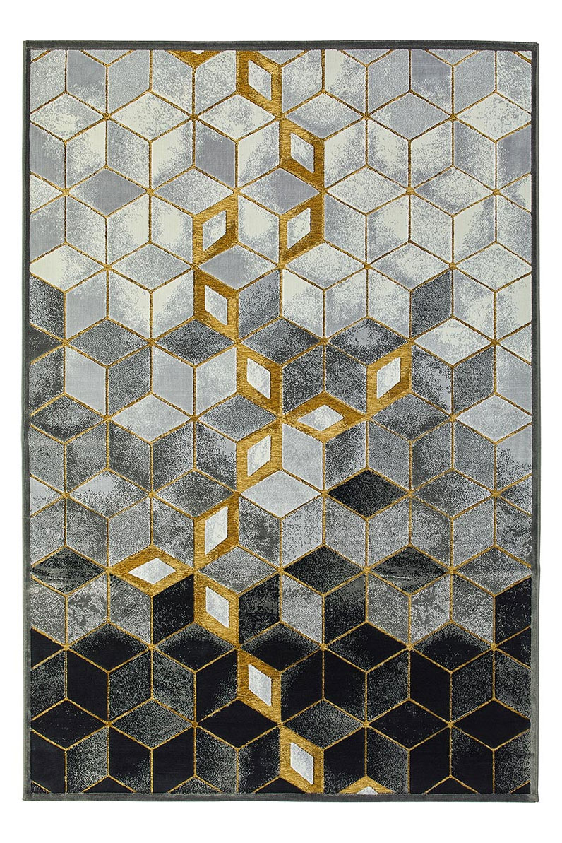 The Gabrielle 755X/Q13 Grey/Gold rectangular rug – 3D cube geometry reinterprets tridimensional design with elegance and modern sophistication. The geometric cube pattern, combining shades of grey with refined golden accents, creates a luminous and elegant optical effect that adds depth to interiors. Perfect for living rooms and dining spaces with a strong yet refined character.