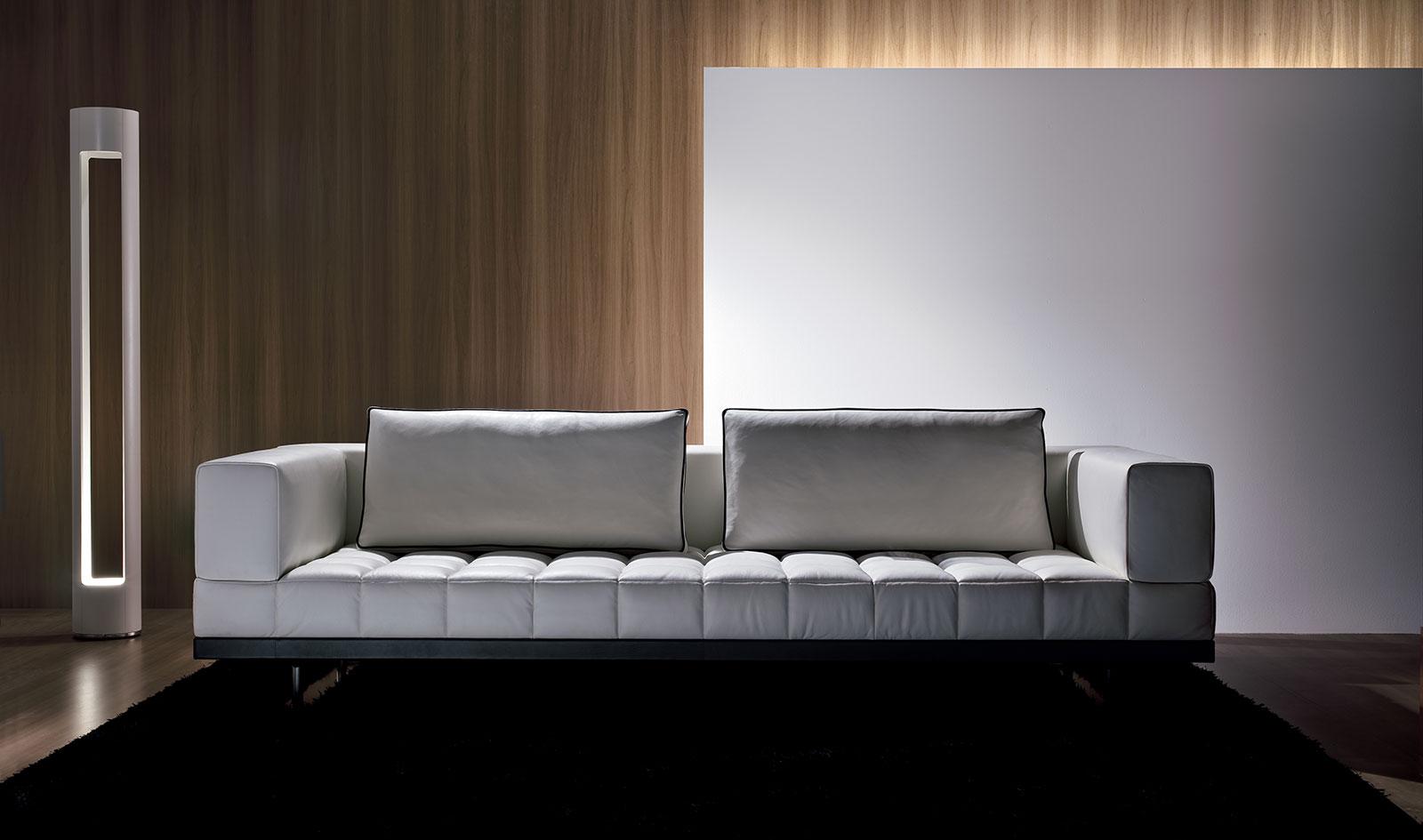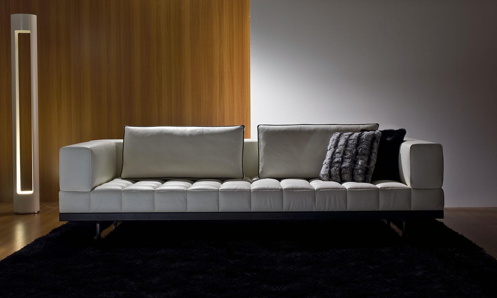 Insula line designed by Luca Scacchetti is a modular custom-made sofa is produced by assembling the various available elements: six seating platforms; five backs and arms; and four back cushions—each of a different dimension.