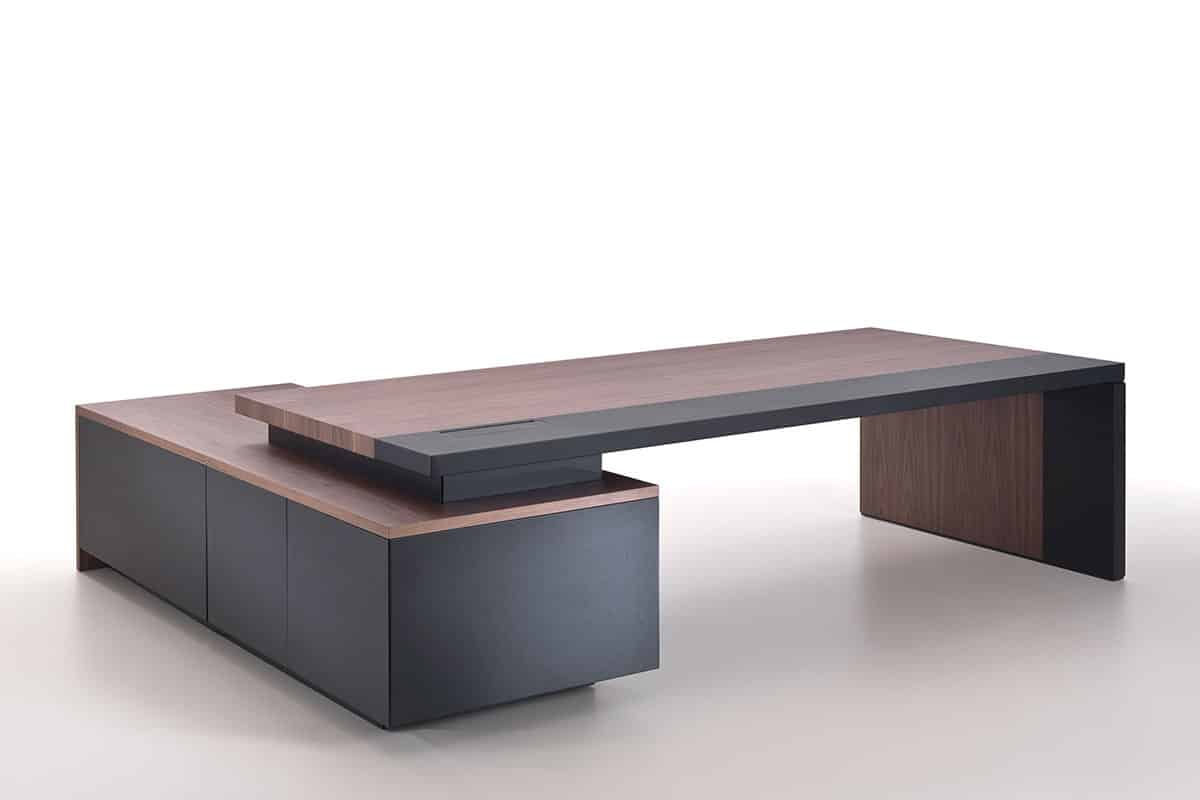 The model proposed here is an executive desk in walnut and black saddle leather.