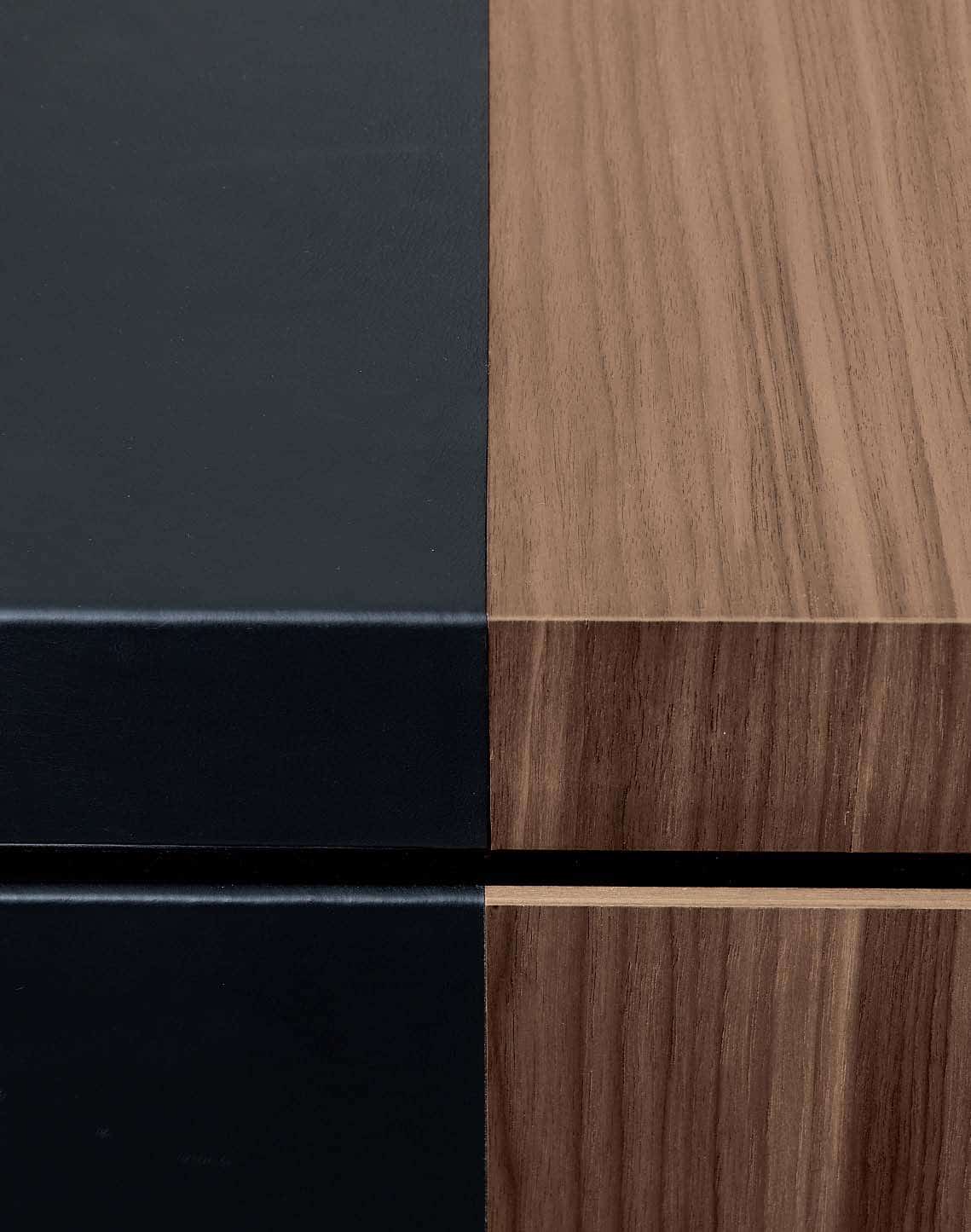 The leg of the desk, in its function to support the top, can be replaced with a fixed pedestal cabinet or by a fixed sideboard cabinet. The fixed pedestal and the fixed sideboard cabinet have a frame with the top in leather or saddle leather or in wood veneer. The fronts are composed by panels, doors and drawers available in the standard finishing; the handles are made with Titanium colour varnished aluminium profile. The drawers are in beech plywood panel black matt lacquered with steel slide runners with damped close.