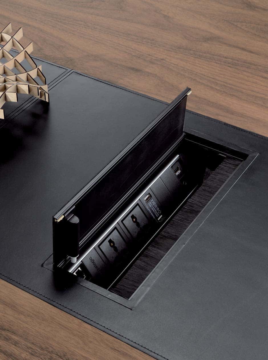 Tops of the desks are equipped with a plug box with 2x universal power sockets, 2x USB, 1x Audio 3.5, 1x HDMI, 2x RJ45 with the top covered in leather or saddle leather.