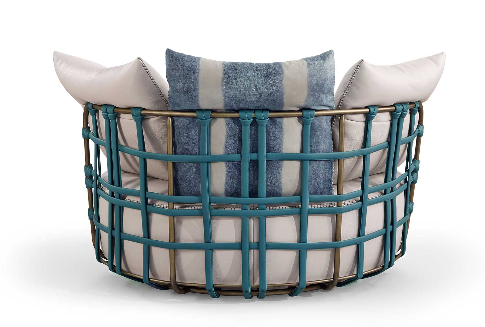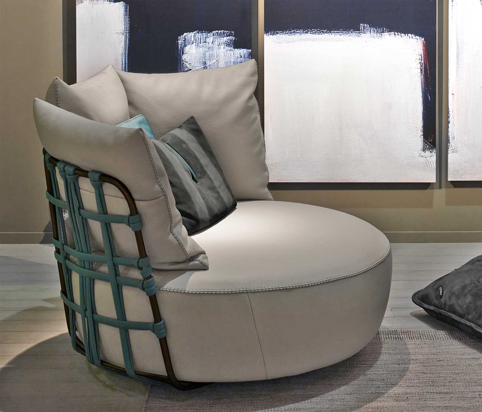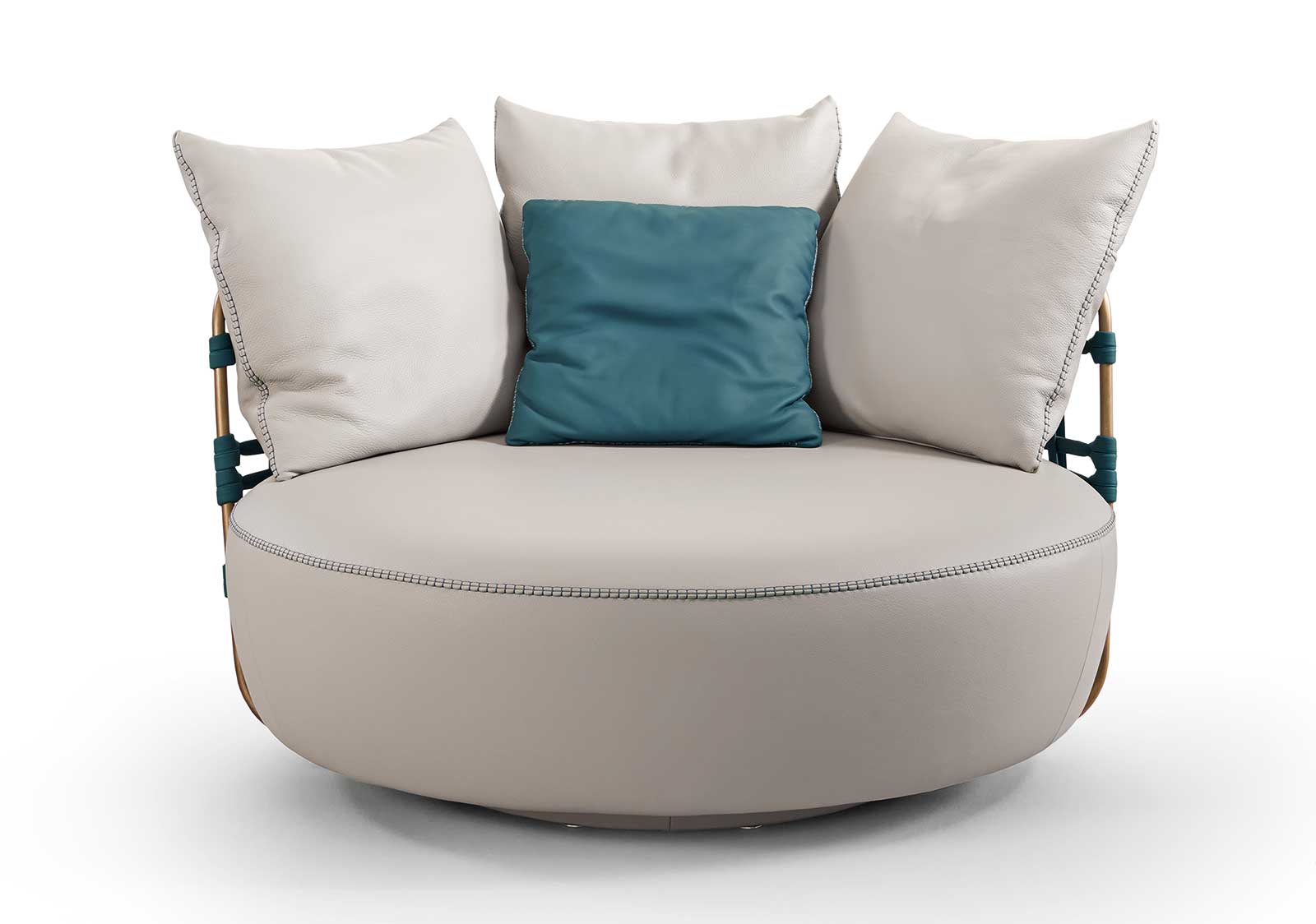 The LOVE armchair can integrate up to 4 different leather colours in the same seat. One can be used for the large seat, one for the 3 back cushions, one for the body ropes (exclusively in the “Maori” leather quality) and lastly, one for the decorative flying cushion.