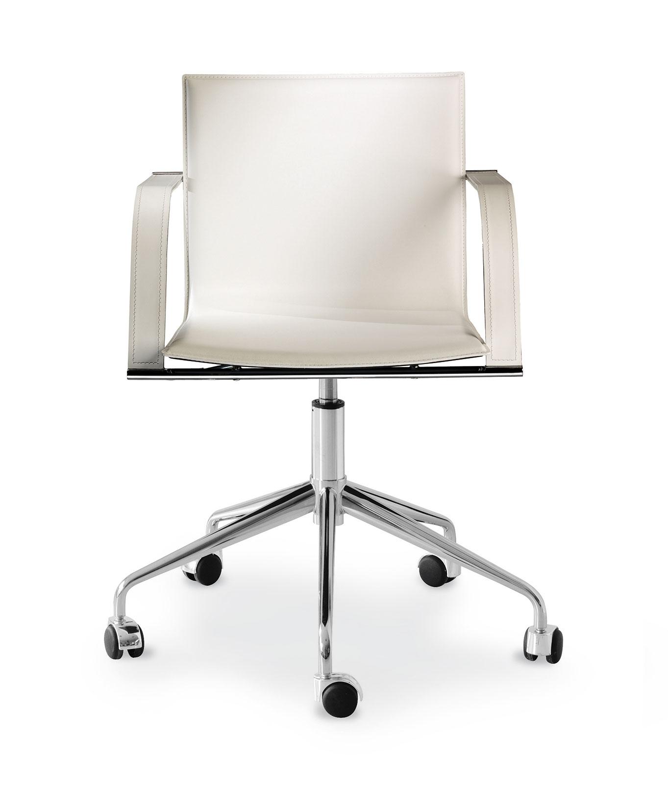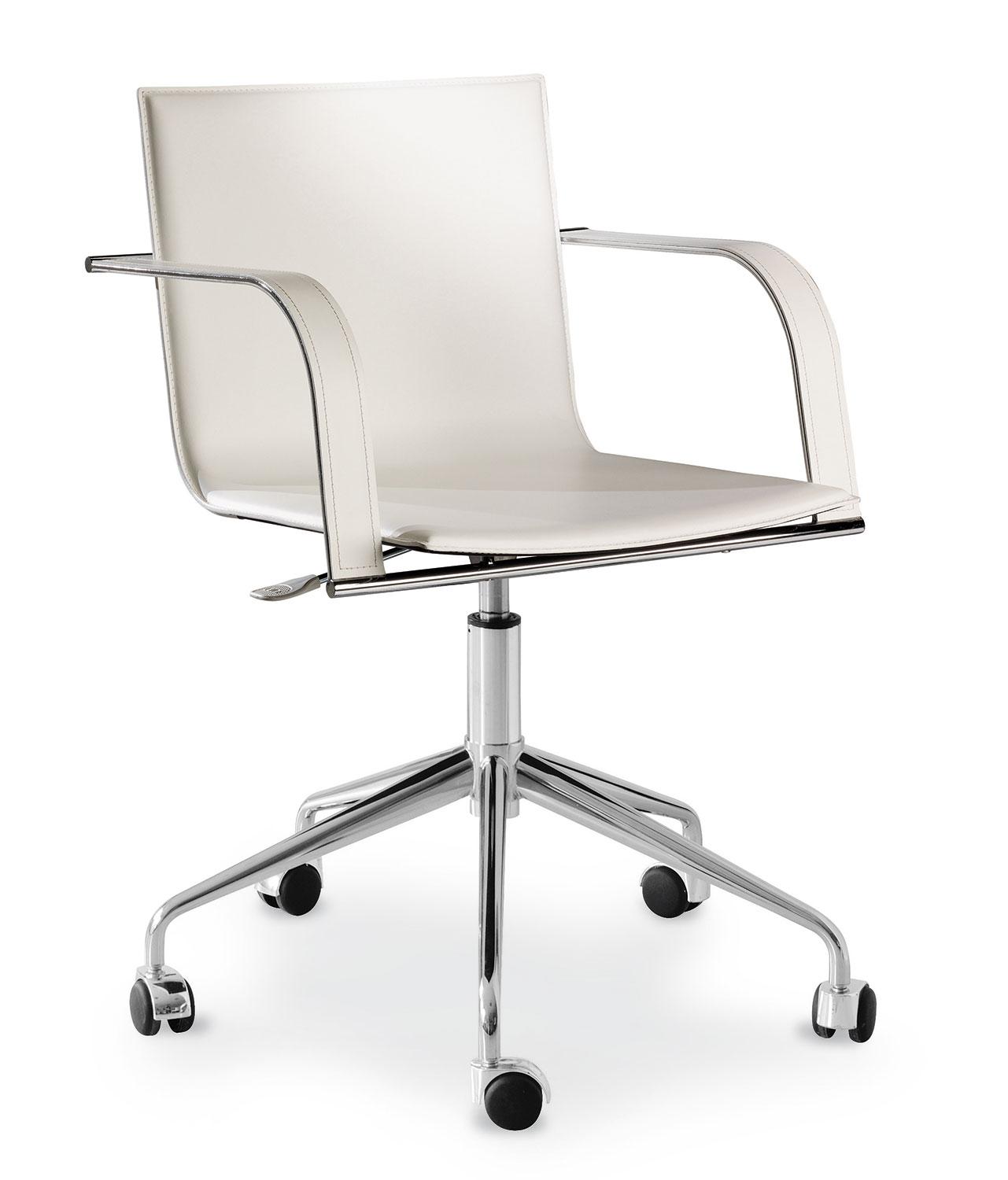 The chair is swivel, has a chrome structure and its base is equipped with 5-arms wheels. It’s height adjustable by gas mechanism.