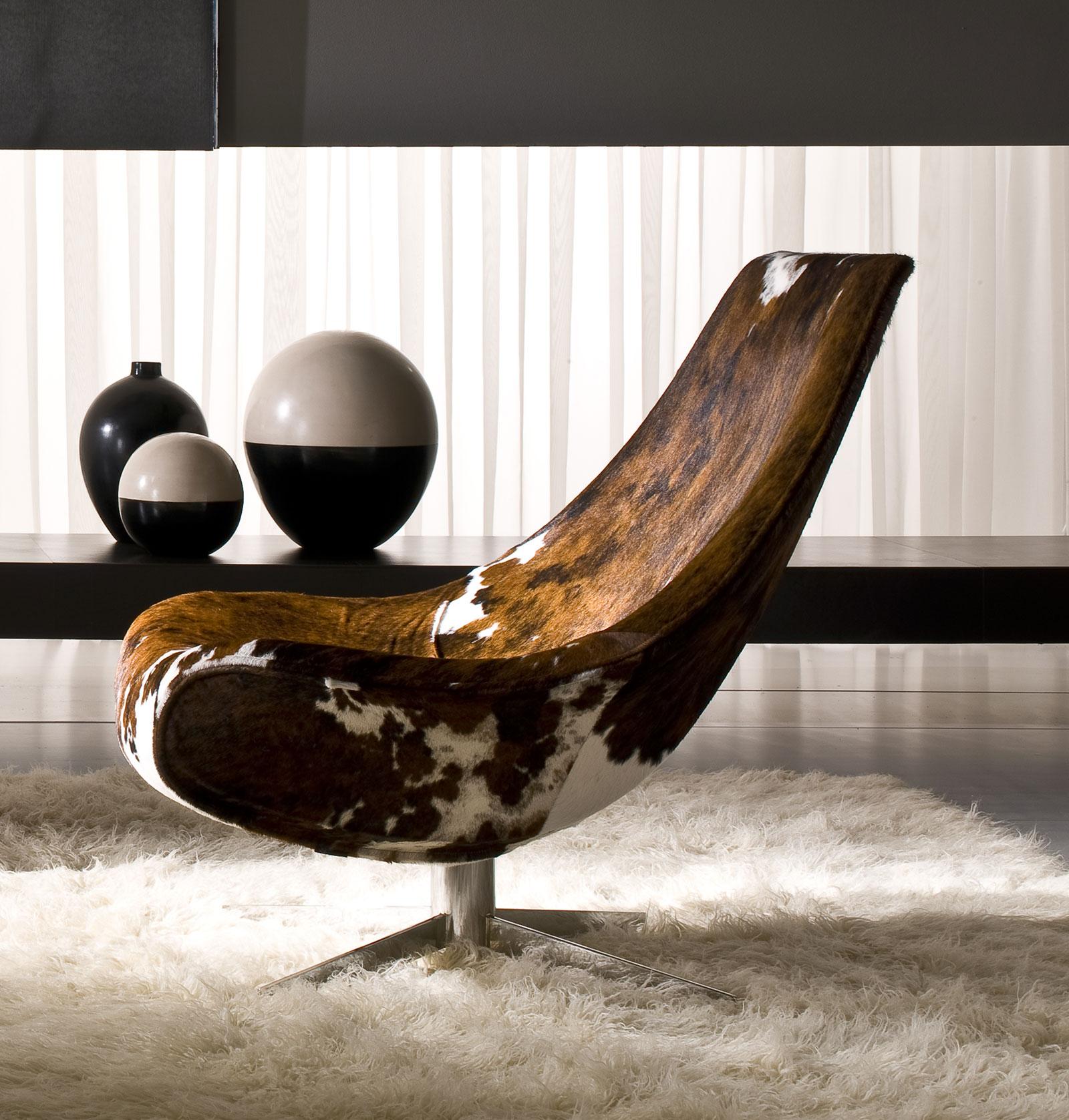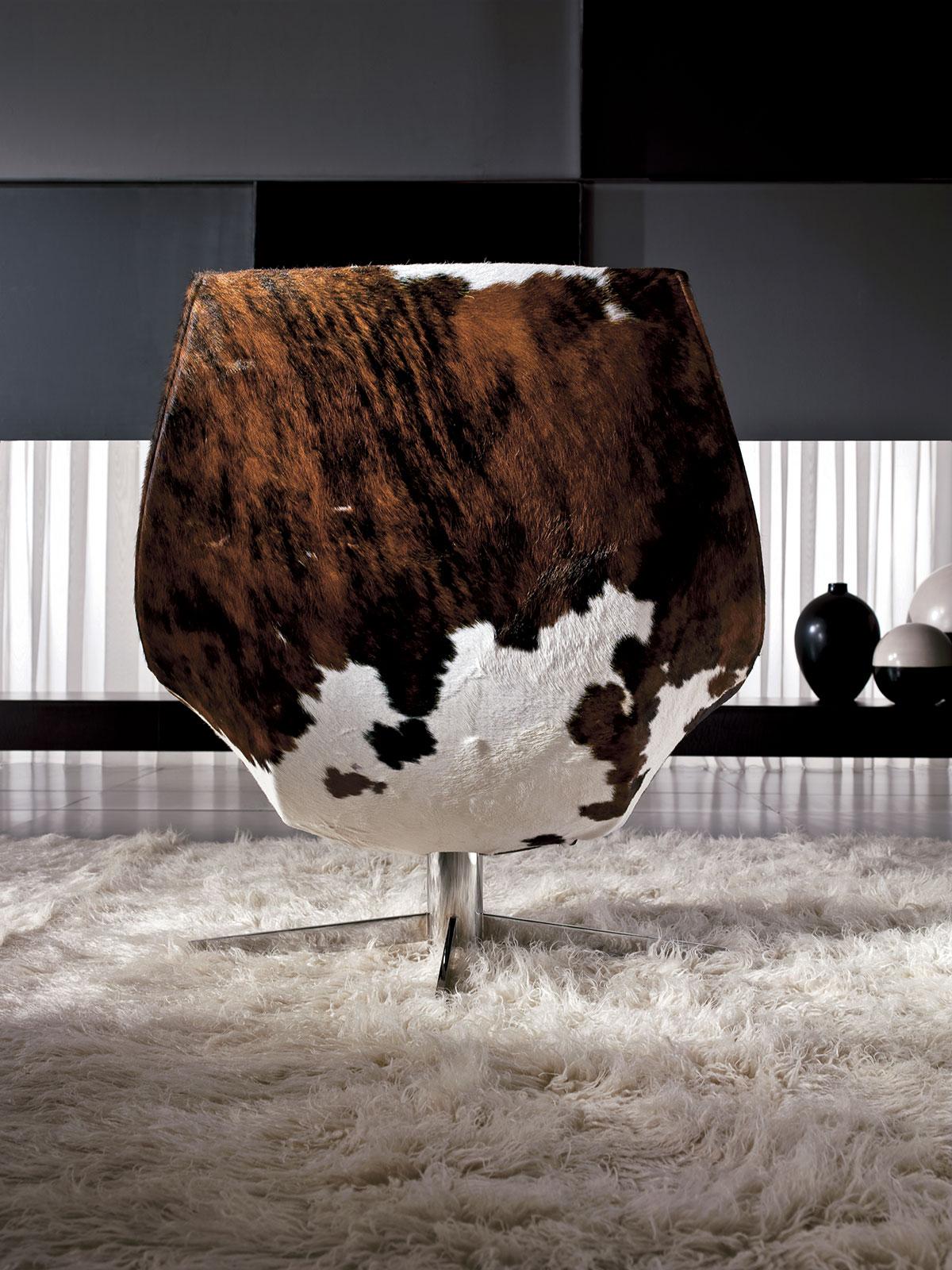 The armchair rests on a solid steel frame with a swivel mechanism. The base is chromed. On demand, it can be lacquered in 9 different colours: ruby red, wine red, sapphire blue, anthracite grey, agate grey, pebble grey, traffic white, grey-brown or jet black.
