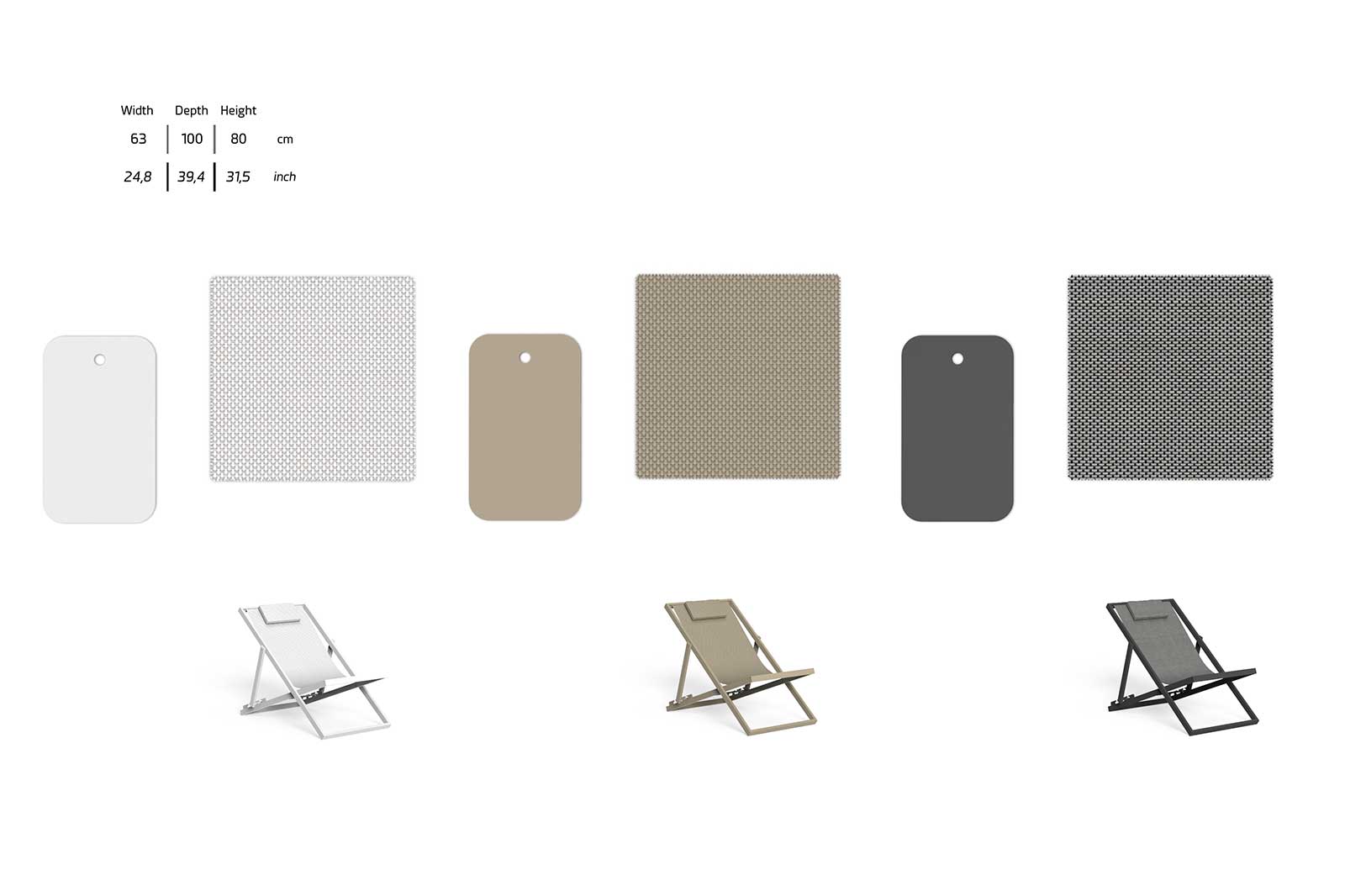 As for the dimensions, the Deck Chair has a width of 83 cm, a depth of 100 cm, and a height of 80 cm. Weighing only 5 kg, it is lightweight and easy to move according to your needs.