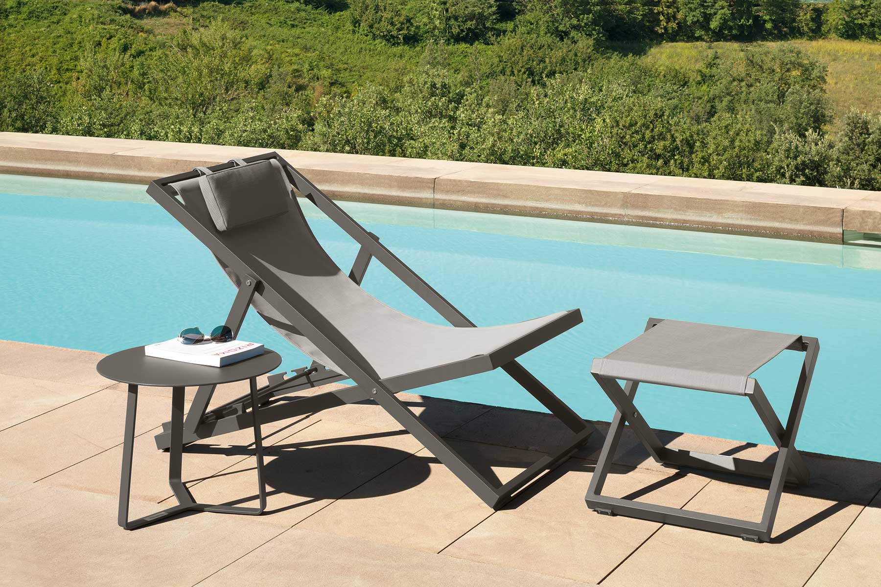 The collection also includes a folding footrest and a round table available in two different sizes.