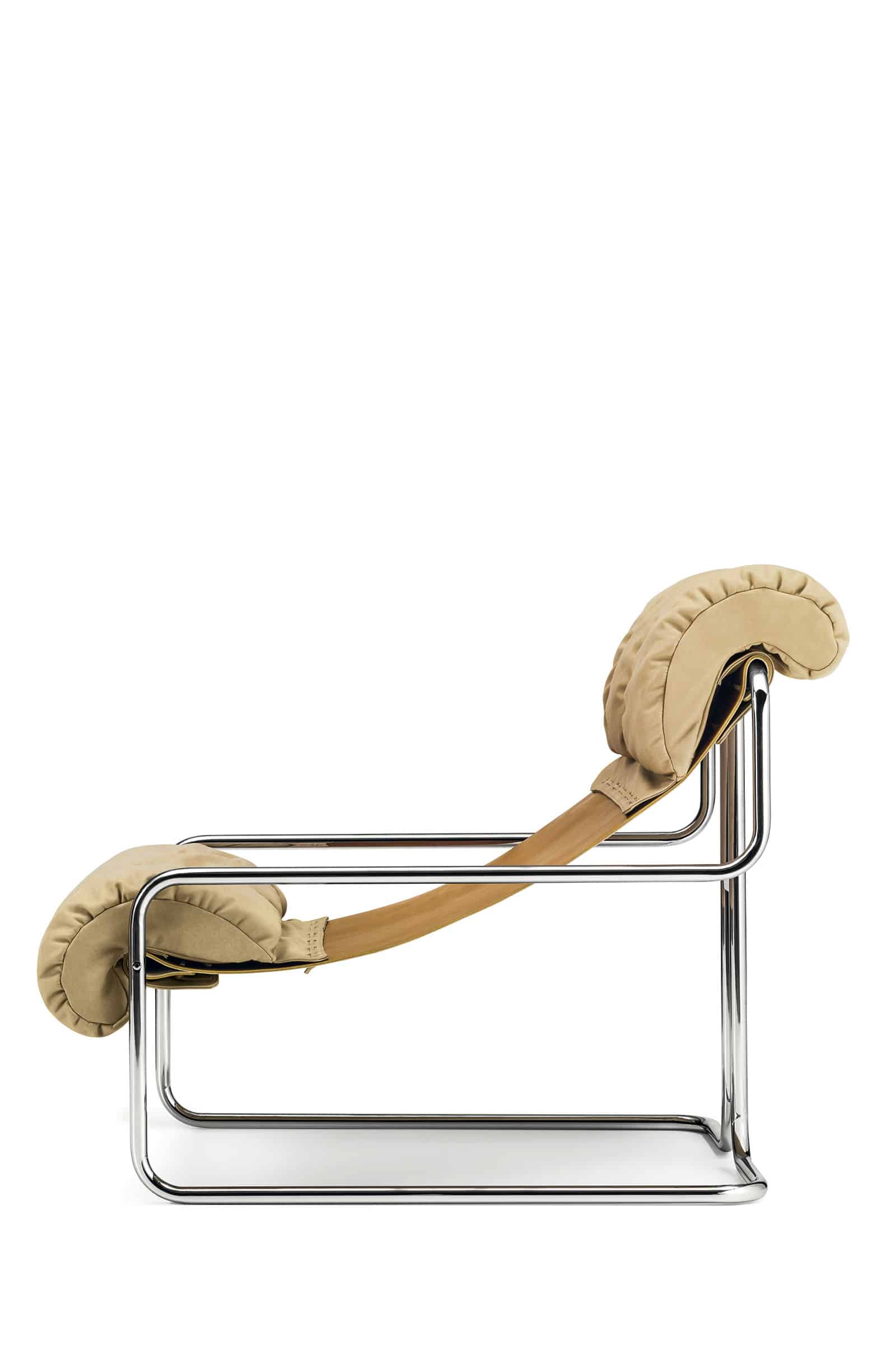 The model proposed here is covered in bicoloured leather and has a shiny chromed structure.