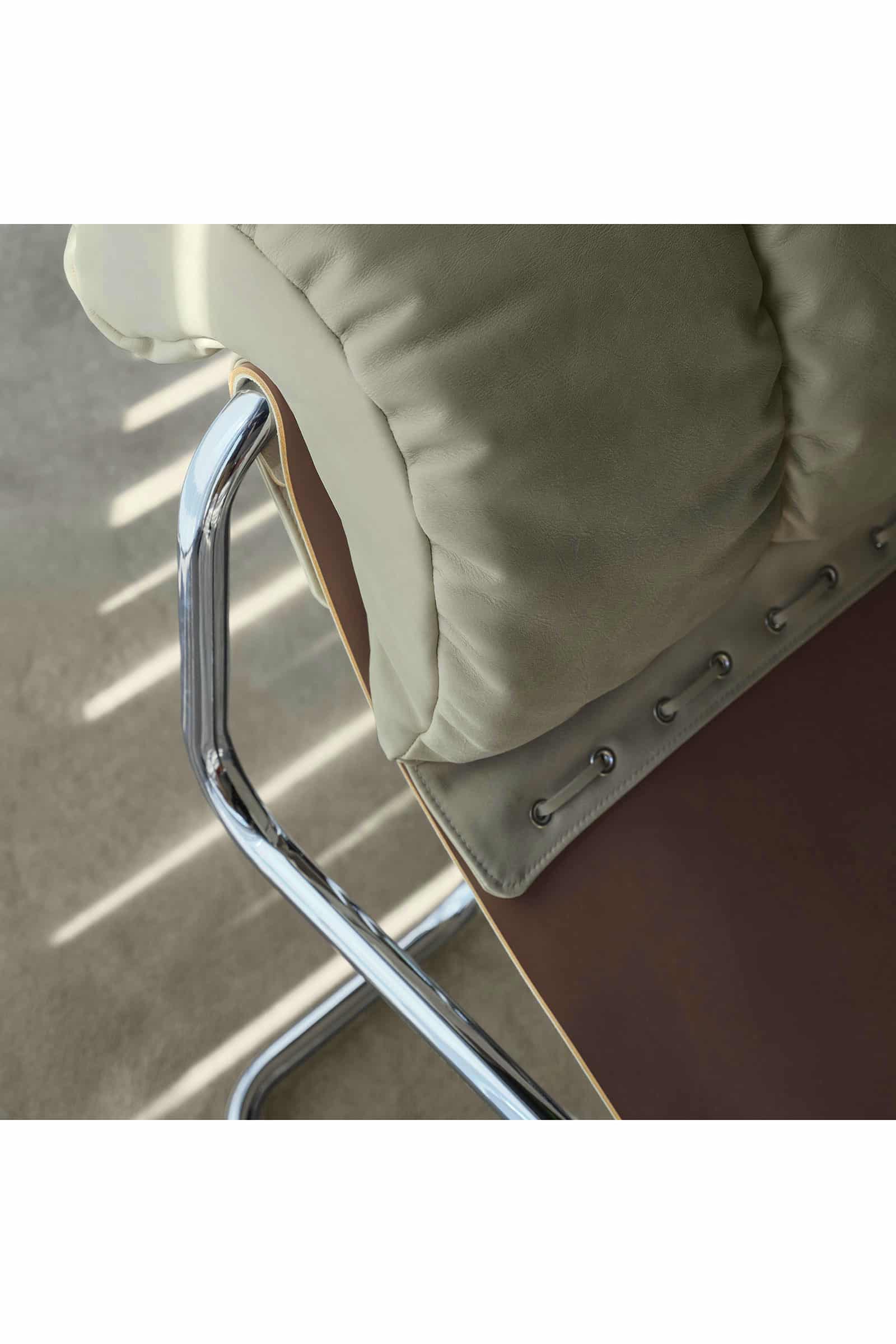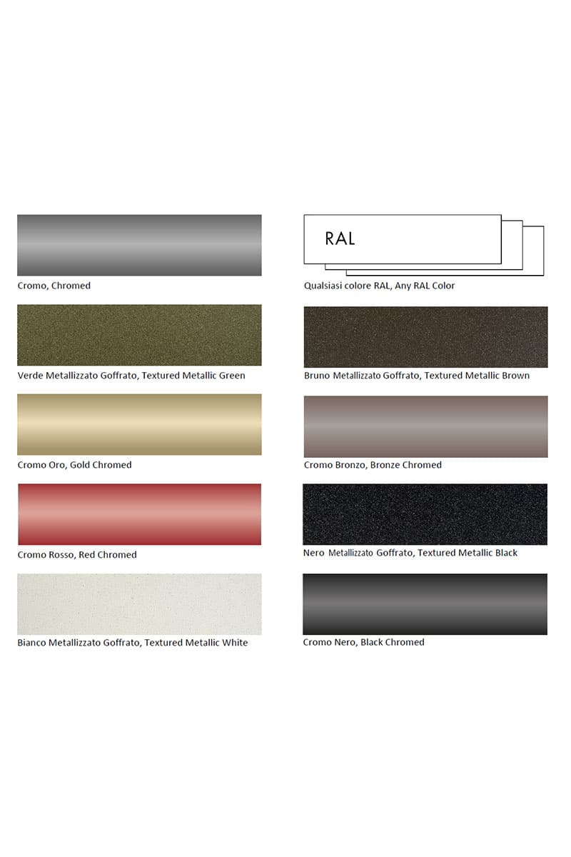 Frame. In tubular steel chromed or epoxy powder painted in the RAL matt colour of your choice or in white, green, brown, or black textured metallic powder coated finish. The seat is made up of a coupled layer of saddle leather in the upper part and soft leather in the lower part.