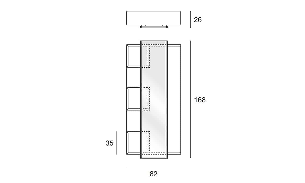 The furniture piece is available in the following dimensions: 82 x 26 x h.168 cm. The three containers have dimensions of 35 by 35 cm and can be placed whether on the right or on the left side of the piece.