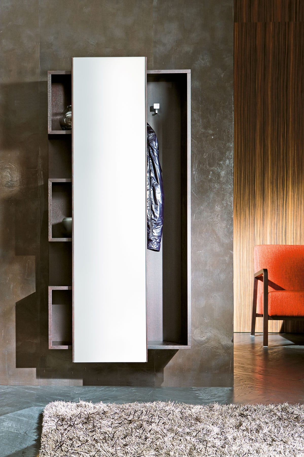 WELL is an entrance furniture piece in plated ash wood. It features a sliding mirror with an aluminum mechanism as well as coat hooks. This product is designed by the architect Fabio Rebosio. WELL is equipped with three separate containers and a clothes compartment made of the best materials available.