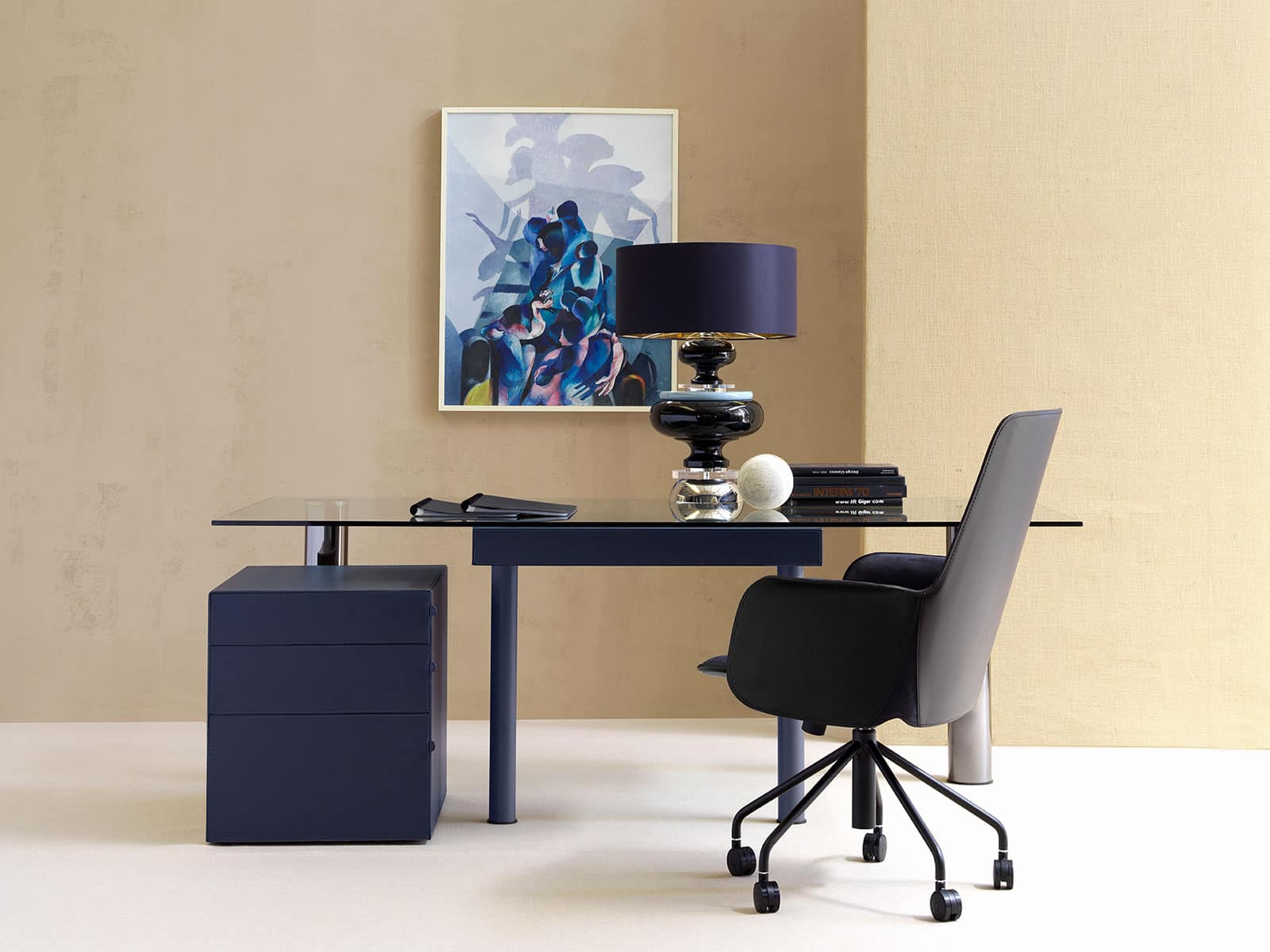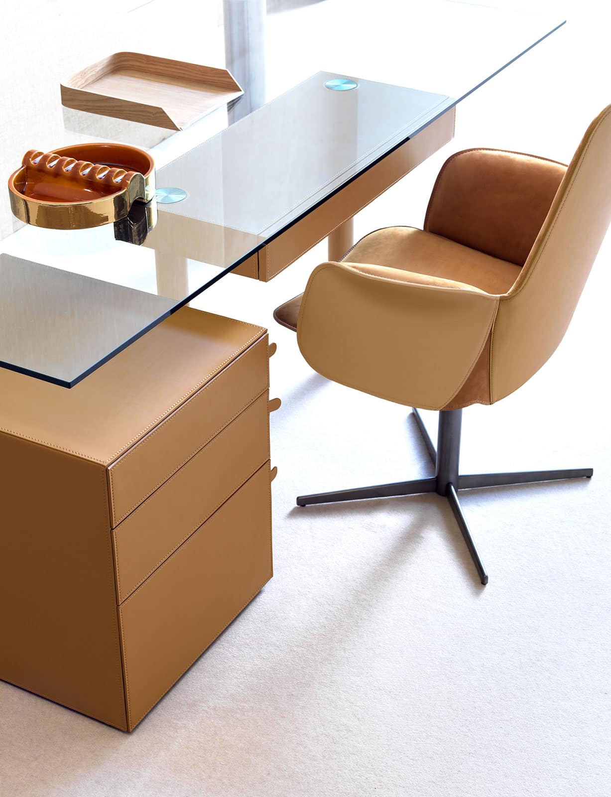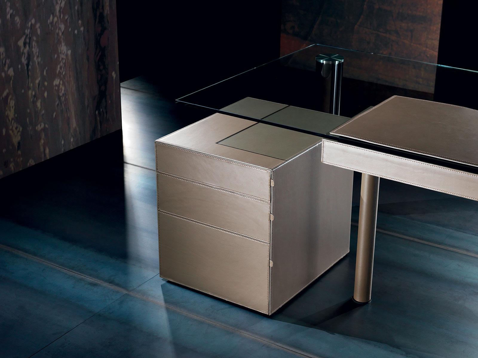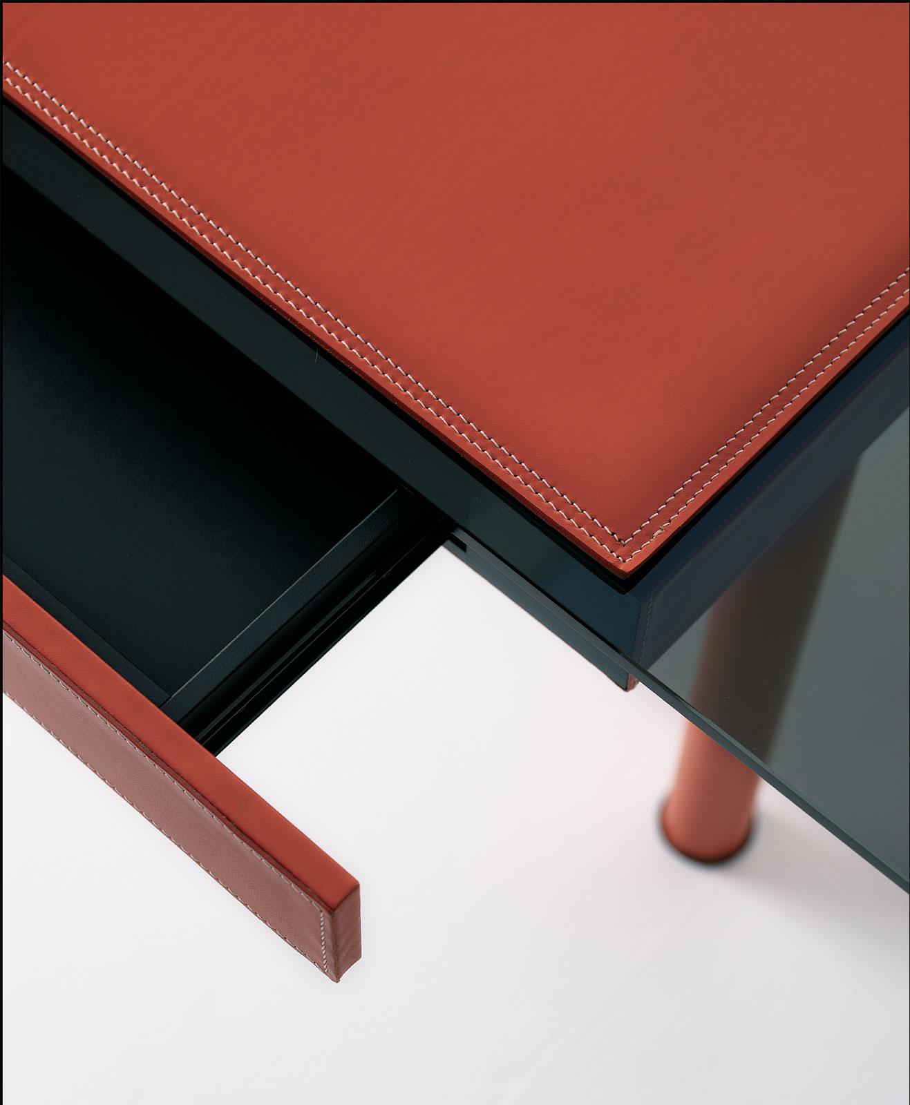 Pour assurer une meilleure protection du plateau en verre, le designer a ajouté un sous-main coordonné au tiroir et aux pieds recouverts de cuir (le sous-main est inclus dans le prix).