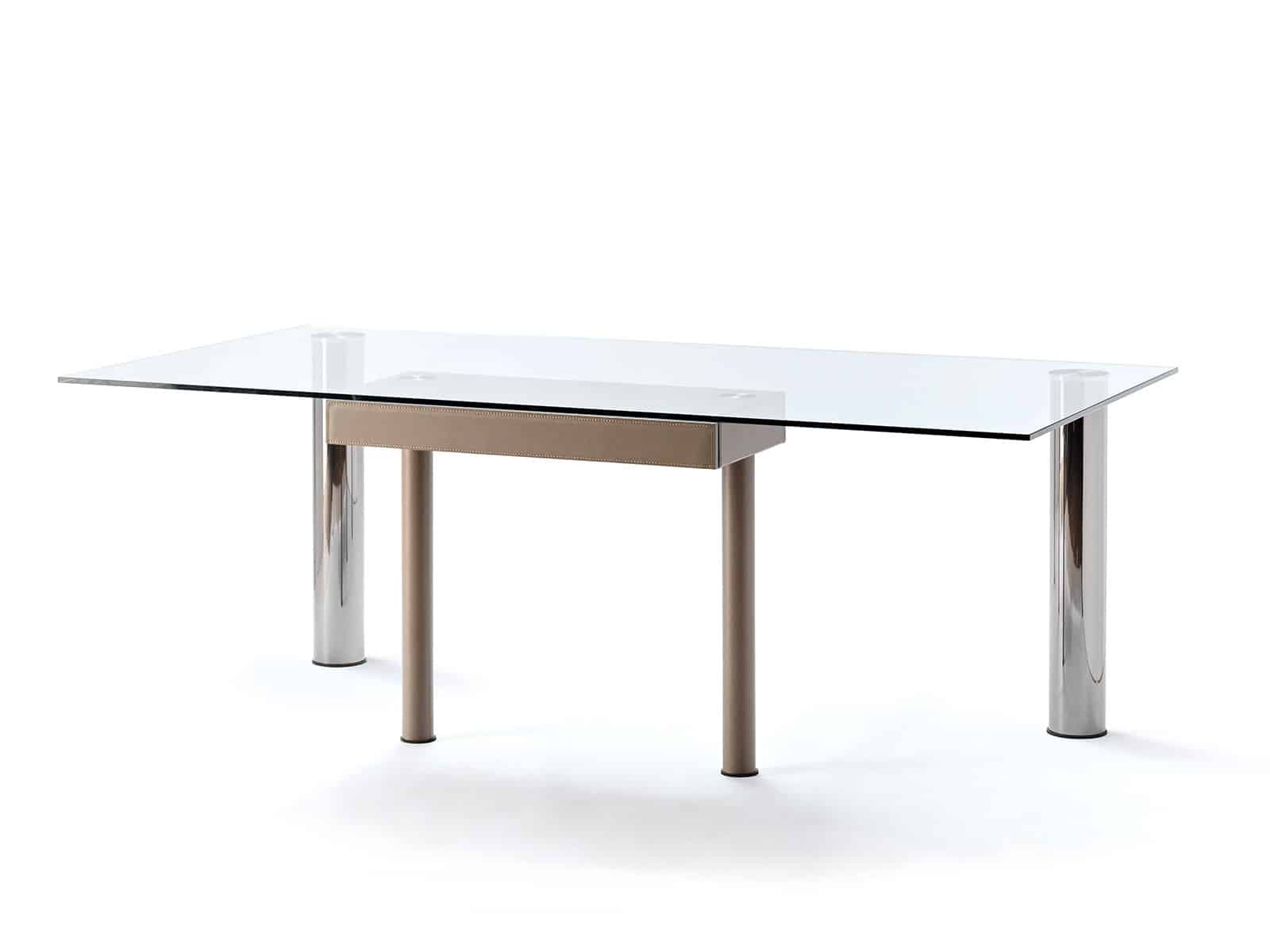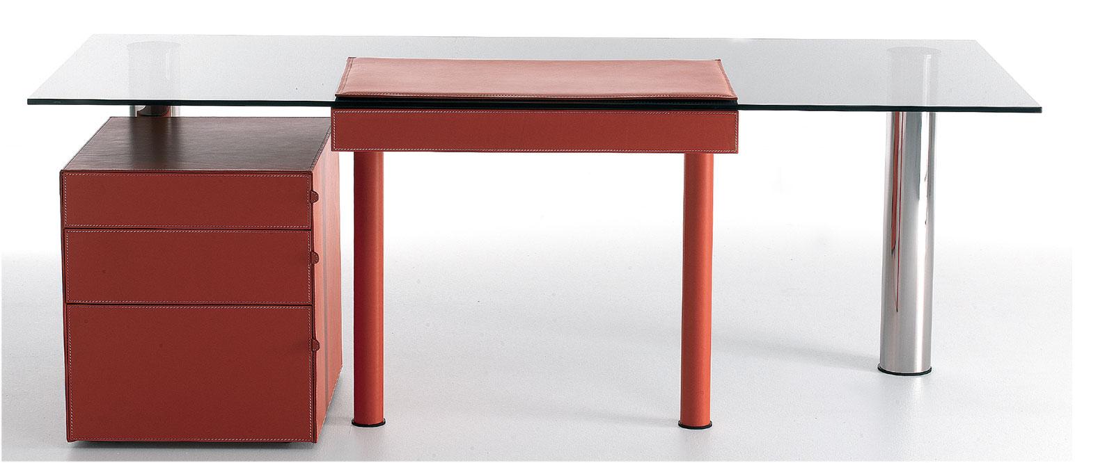 Les pieds qui soutiennent le plateau sont en acier inoxydable. Les pieds avant sont recouverts de cuir pleine fleur et sont plus rapprochés que les pieds arrière, qui sont en acier avec un diamètre plus grand. Le résultat est un contraste magnifique, offrant une perspective particulière et une originalité unique à l’ensemble du bureau. Le plateau semble suspendu. Les pieds recouverts de cuir supportent un tiroir, également recouvert de cuir.