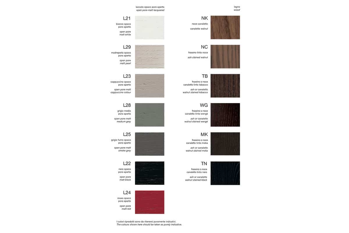 D’autres finitions sont disponibles sur demande pour la structure, comme les finitions wengé, noyer, tabac, moka ou le bois massif de noyer Canaletto, ainsi que les finitions laquées opaque à pore ouvert disponibles dans différentes couleurs.