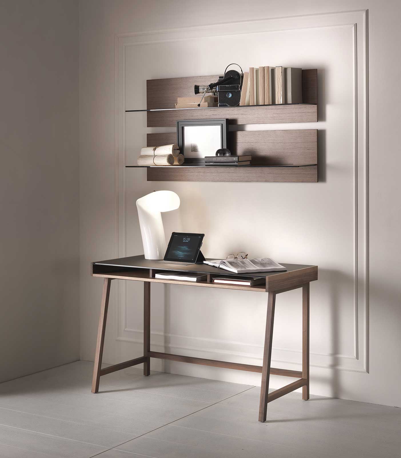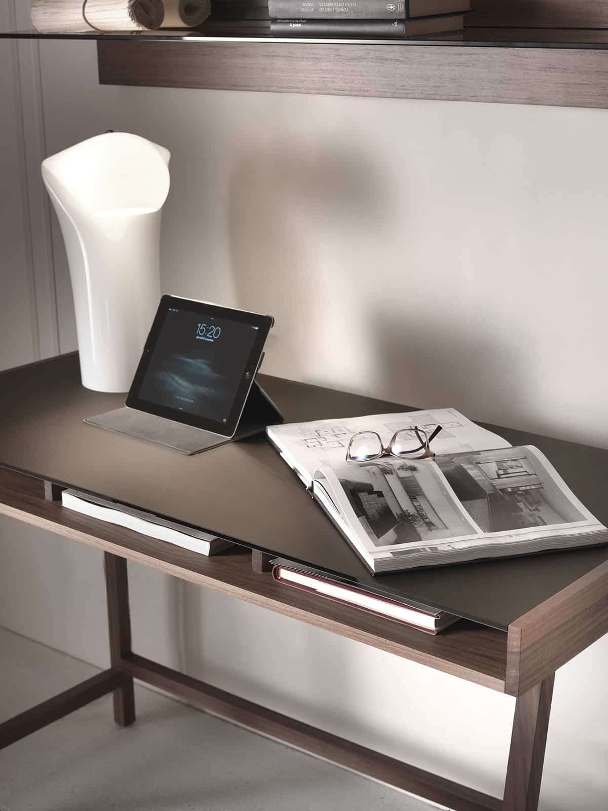 ARCANO est un secrétaire en bois massif de frêne teinte noyer et top en verre trempé couleur moka dessiné par l’architecte Fabio Rebosio.