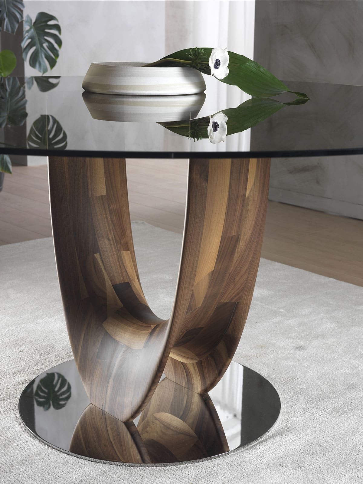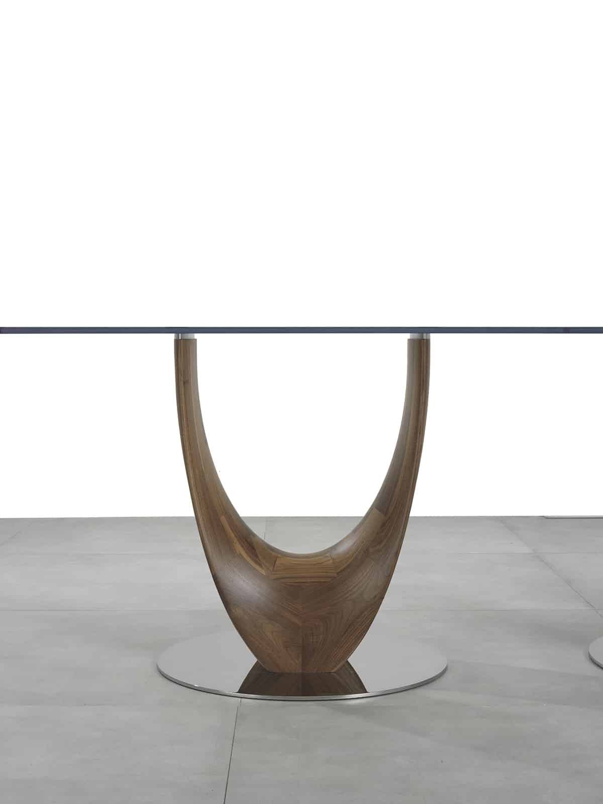 Le pied très original est en bois massif de noyer Canaletto et posé sur une base circulaire en métal chromé.