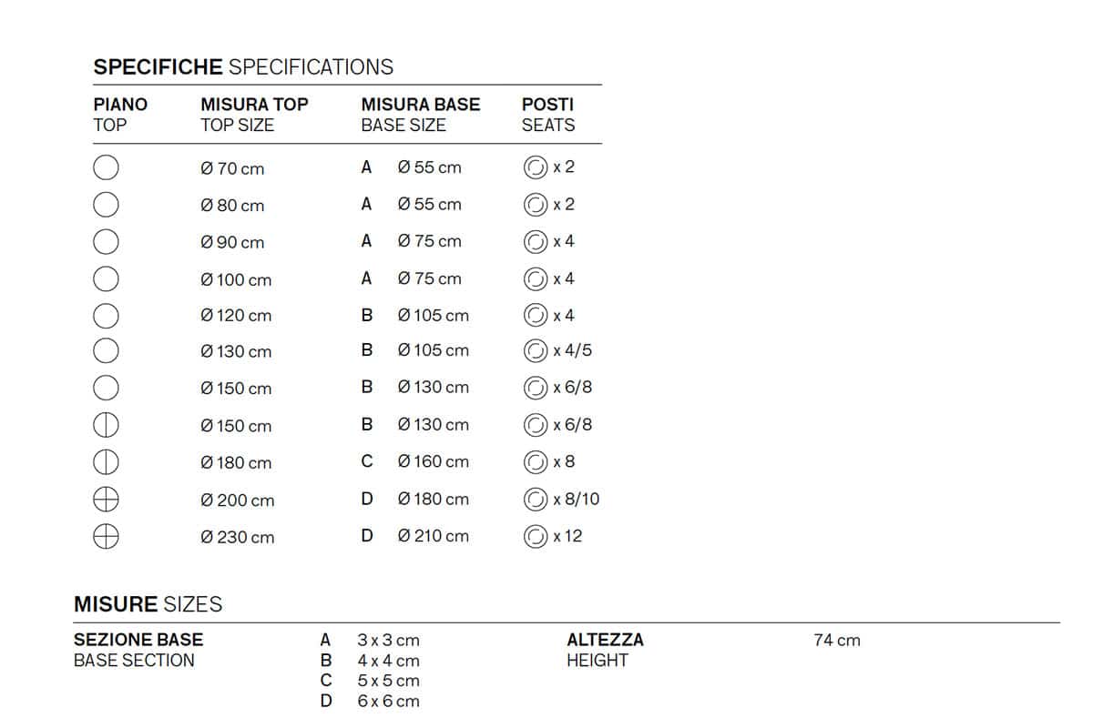 La table Bistrot est entièrement personnalisable en taille, pour s’adapter à tous les environnements. Elle est disponible avec un diamètre allant de 70 cm à 230 cm, avec une structure proportionnée au poids et à la taille du plateau :