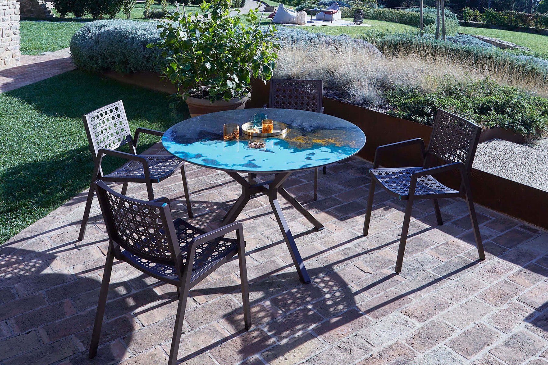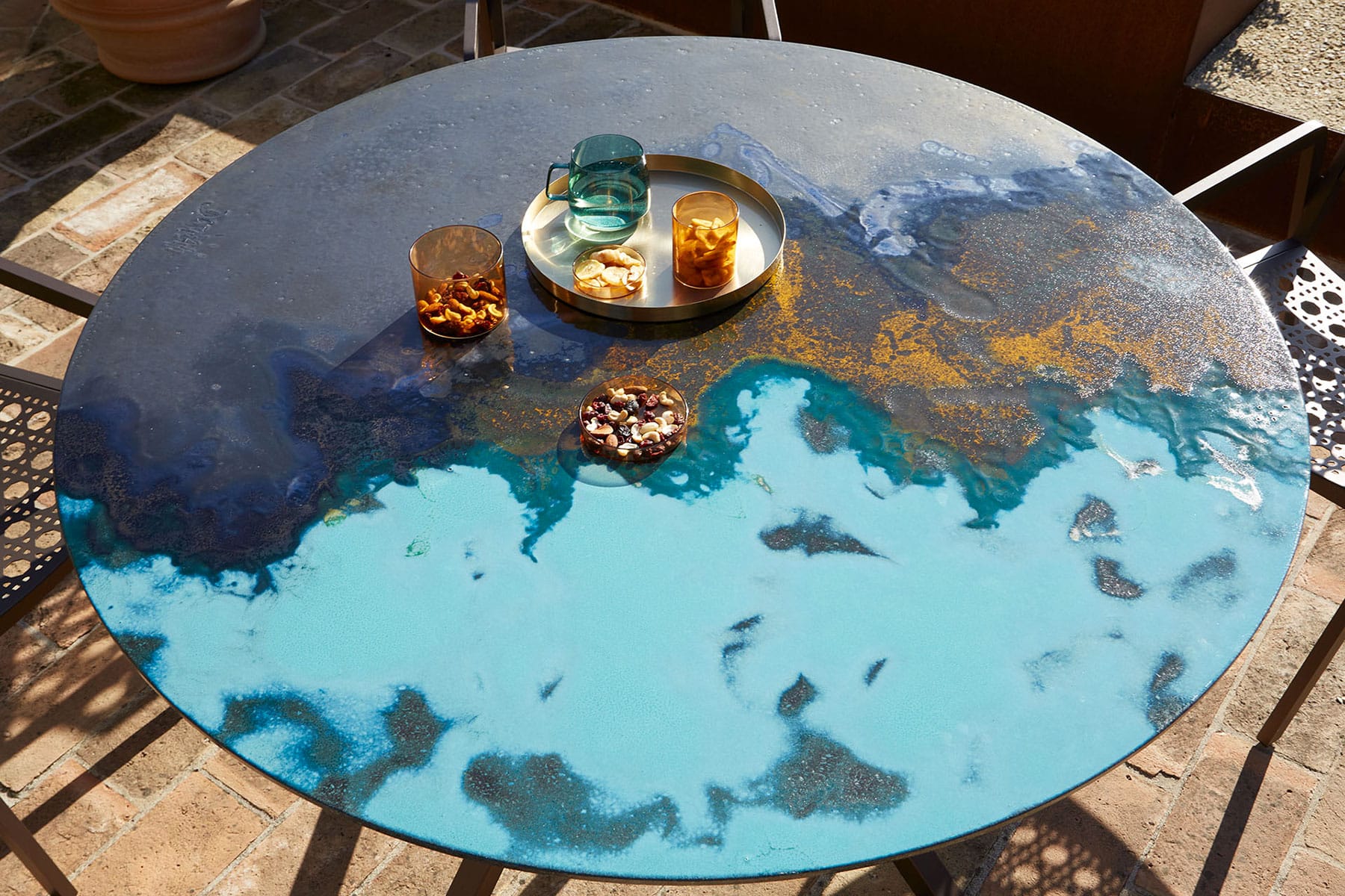 Le modèle présenté ici a un diamètre de 120 cm et arbore la finition Éolie, inspirée de la beauté brute et sauvage de l’archipel volcanique du même nom.