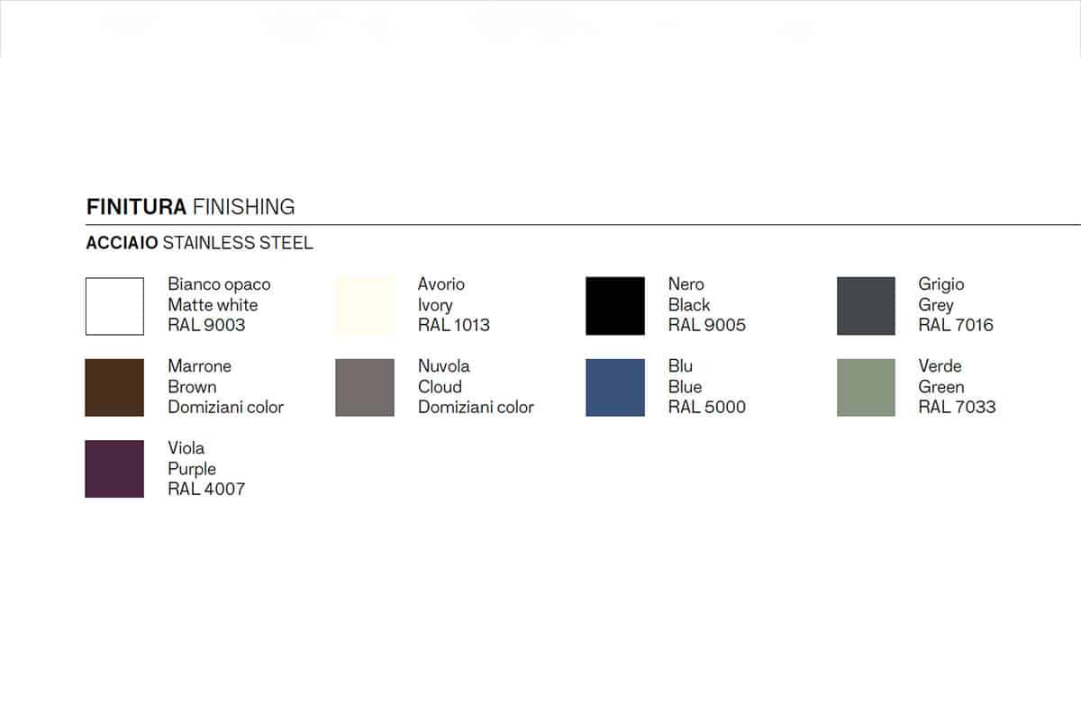 La structure en acier inoxydable AISI 304 est disponible en neuf finitions laquées, permettant de créer des associations harmonieuses ou des contrastes audacieux, selon vos envies.
