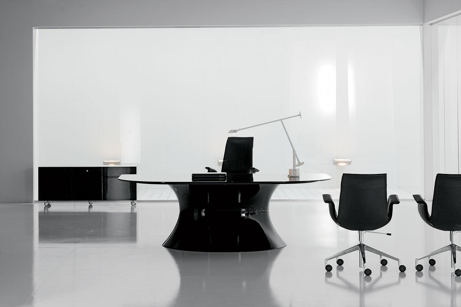 Ce bureau directionnel est caractérisé par un pied en forme de coquillage, réalisé en Cristalplant® laqué noir brillant.