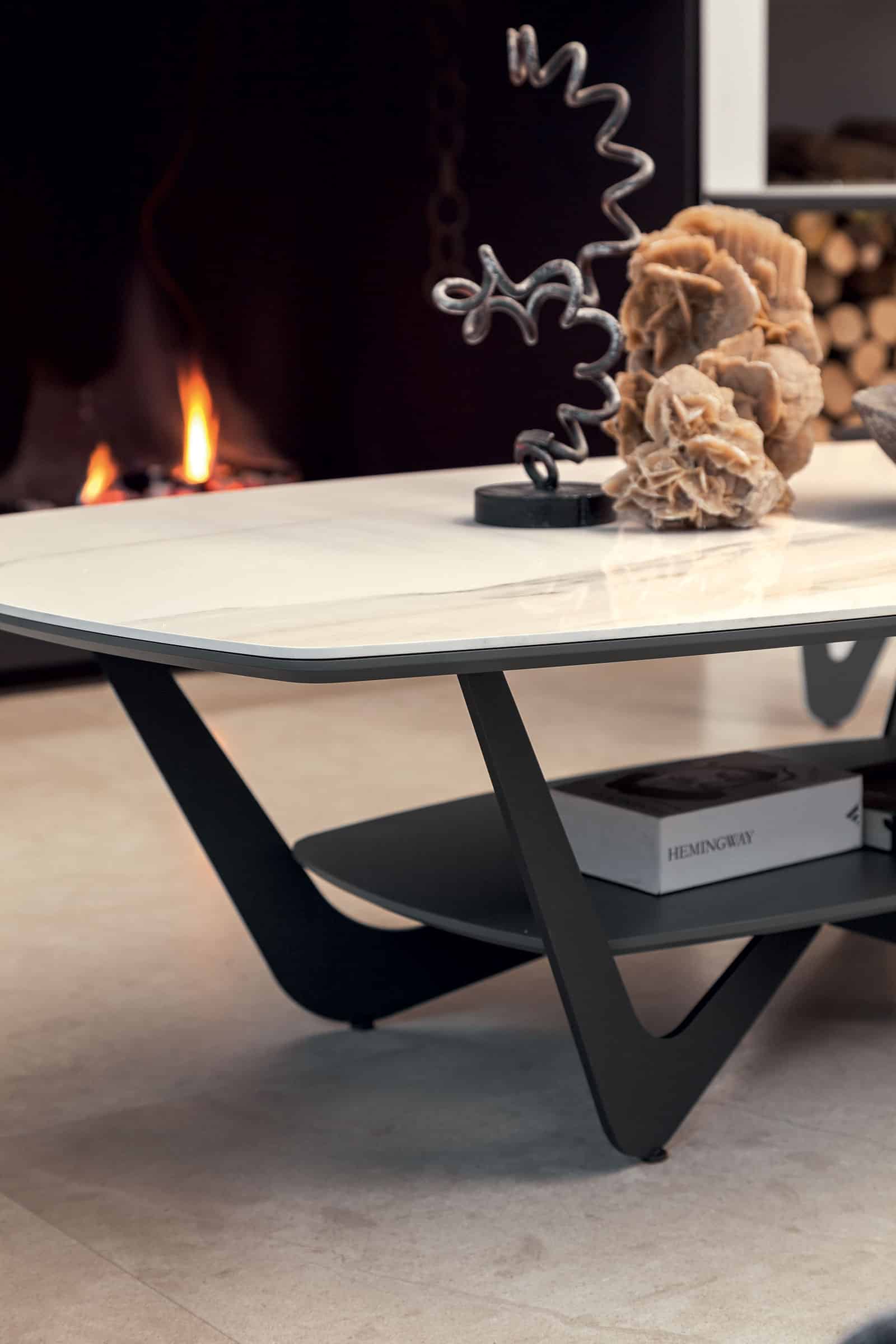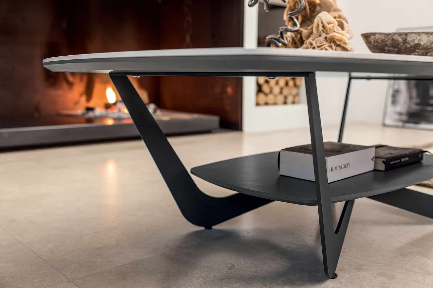 Sur la photo, la table basse est présentée avec le plateau supérieur en céramique finition brillante « Calacatta Gold Lucido K13« .