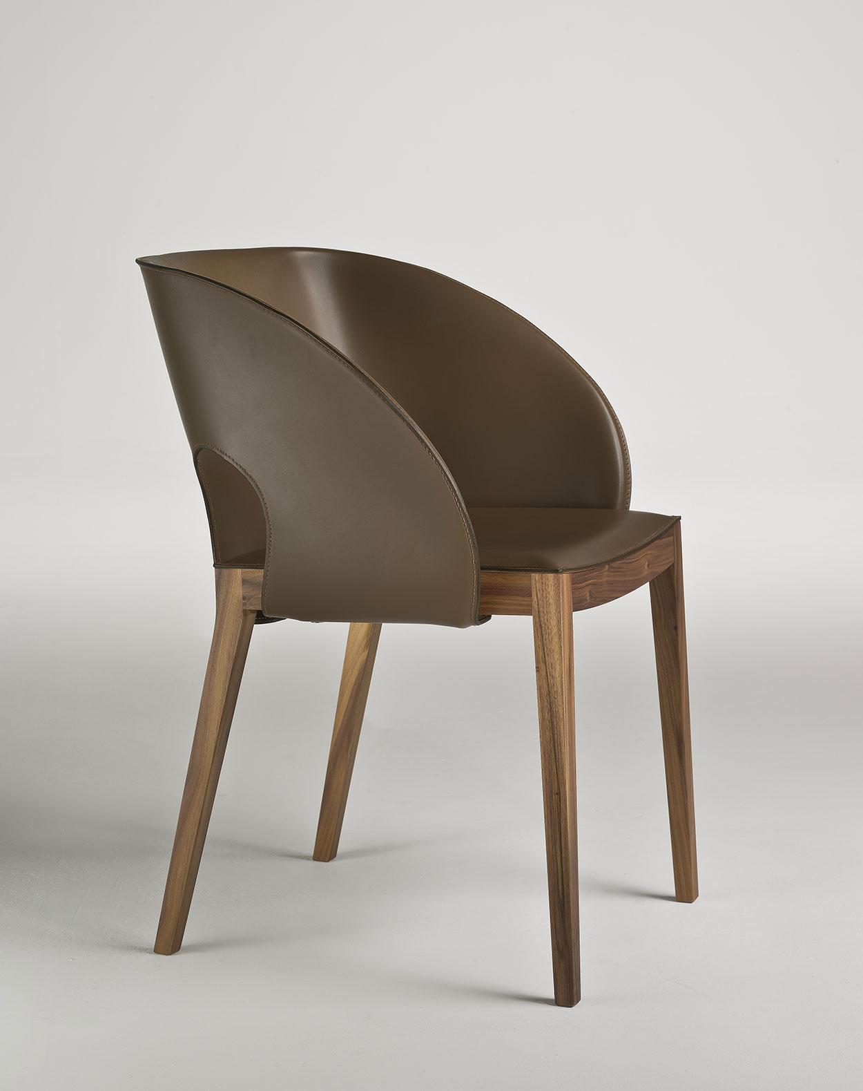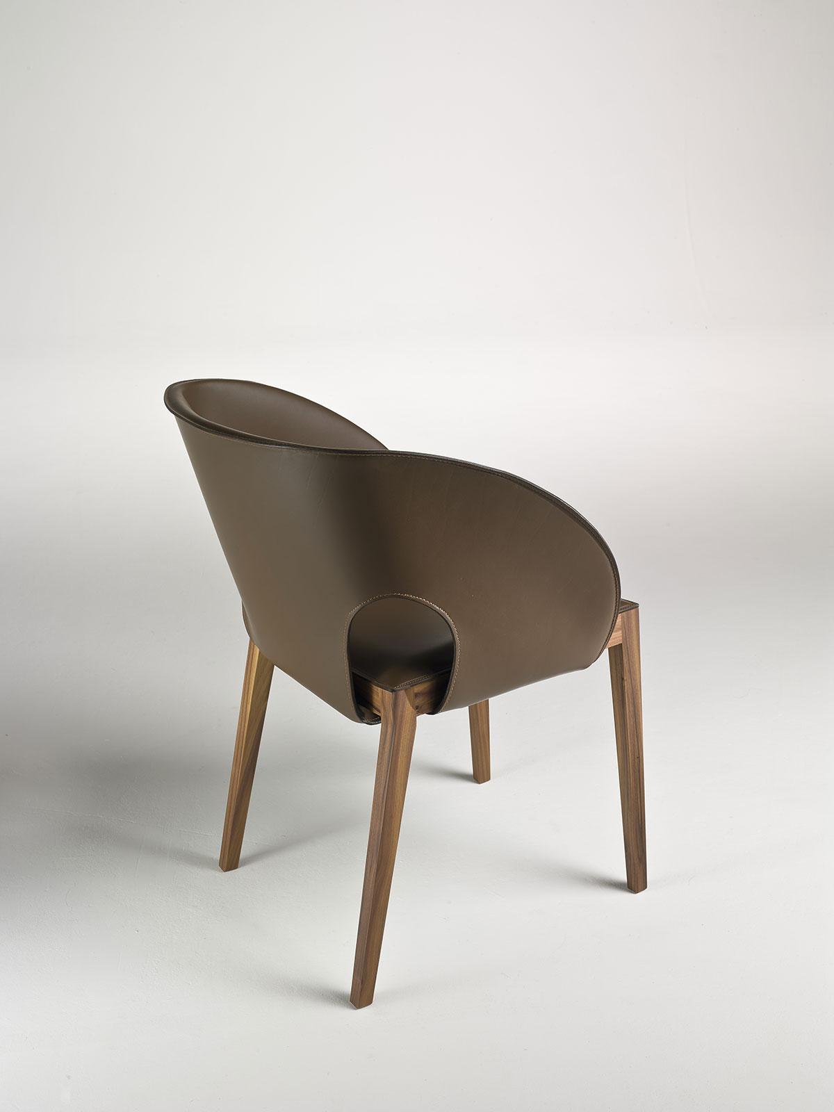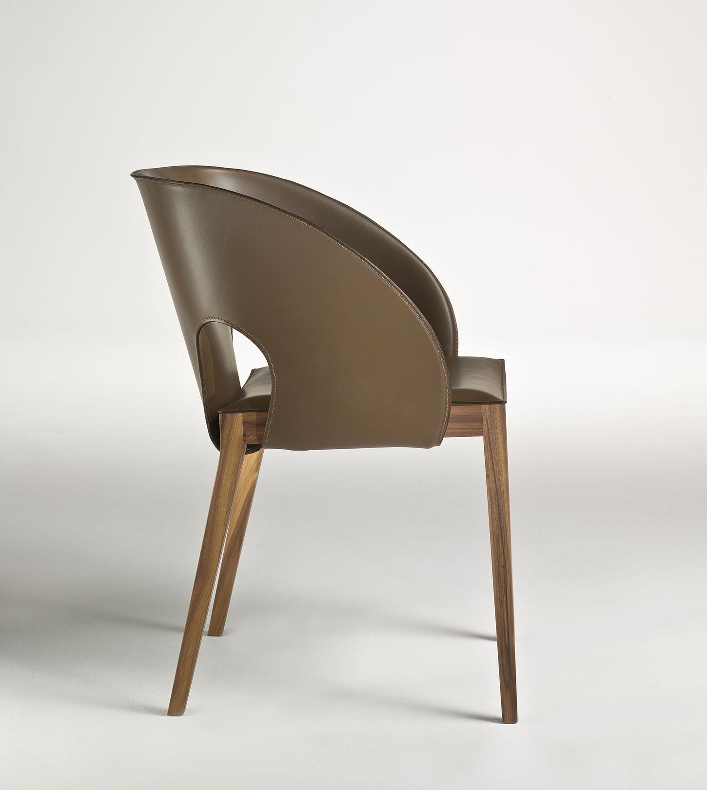Voile est une chaise très confortable rendue encore plus accueillante par un dossier enveloppant en cuir aux lignes qui rappellent le mouvement d’une voile déployée.