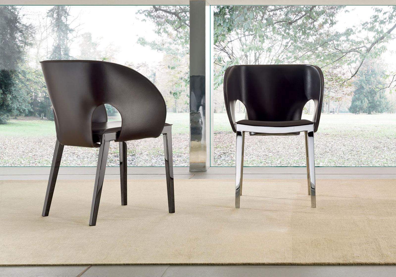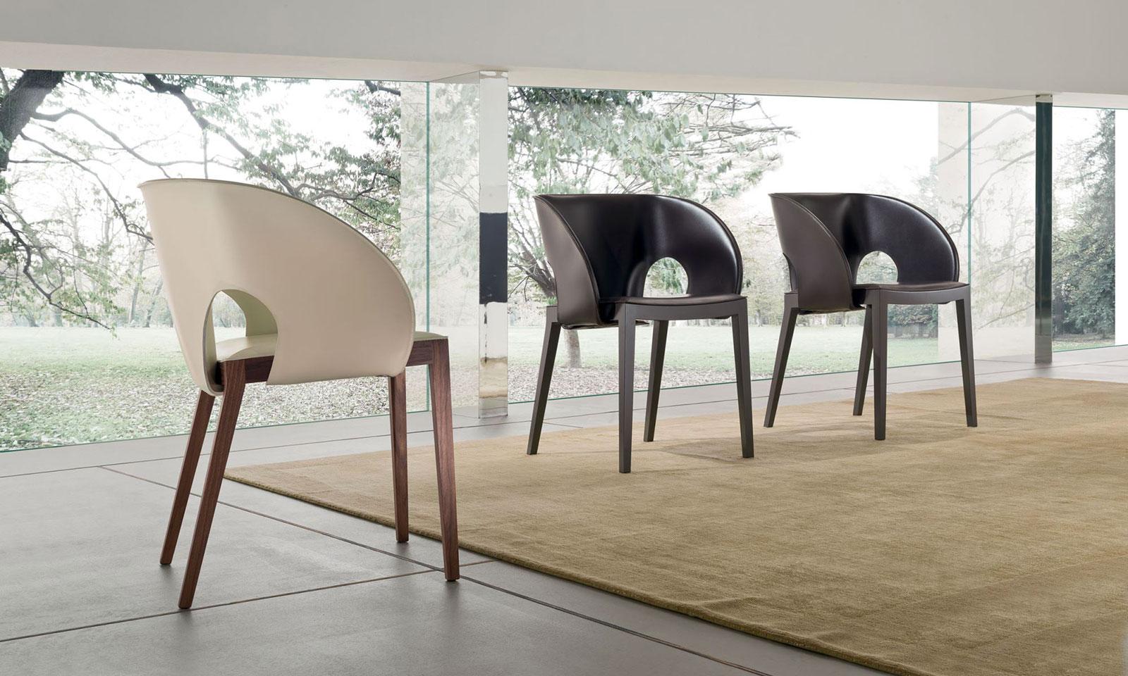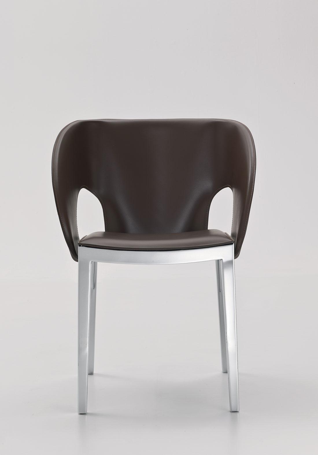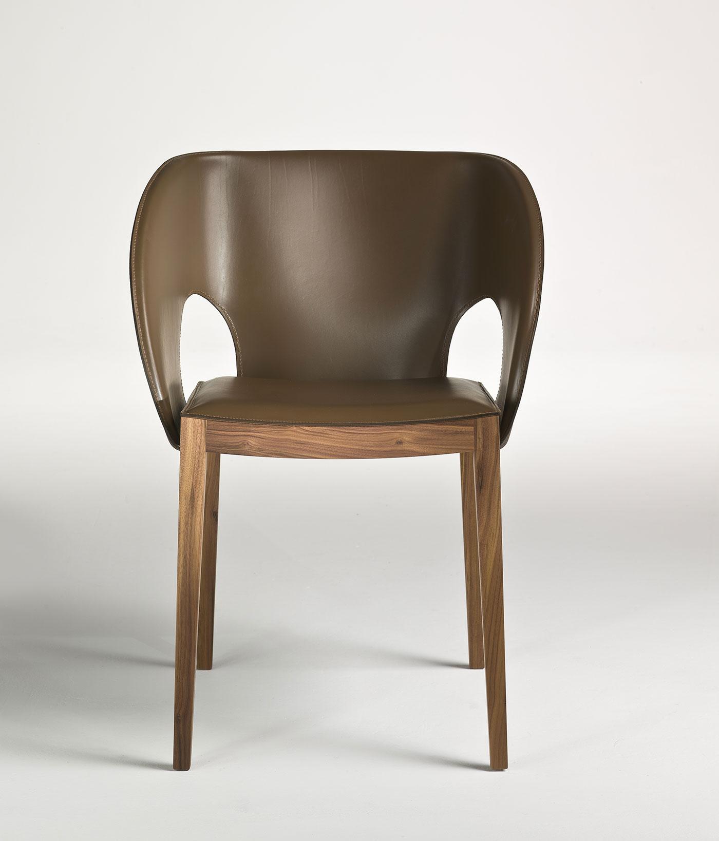 Voile est une chaise très confortable rendue encore plus accueillante par un dossier enveloppant en cuir aux lignes qui rappellent le mouvement d’une voile déployée.