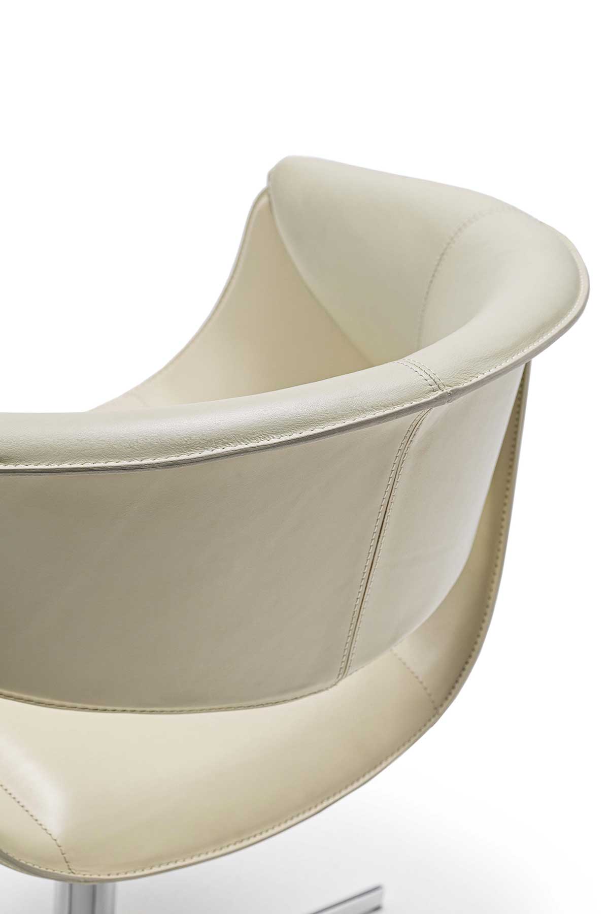 La seduta girevole è in acciaio e leggermente imbottita, rivestita in cuoio o pelle pieno fiore.