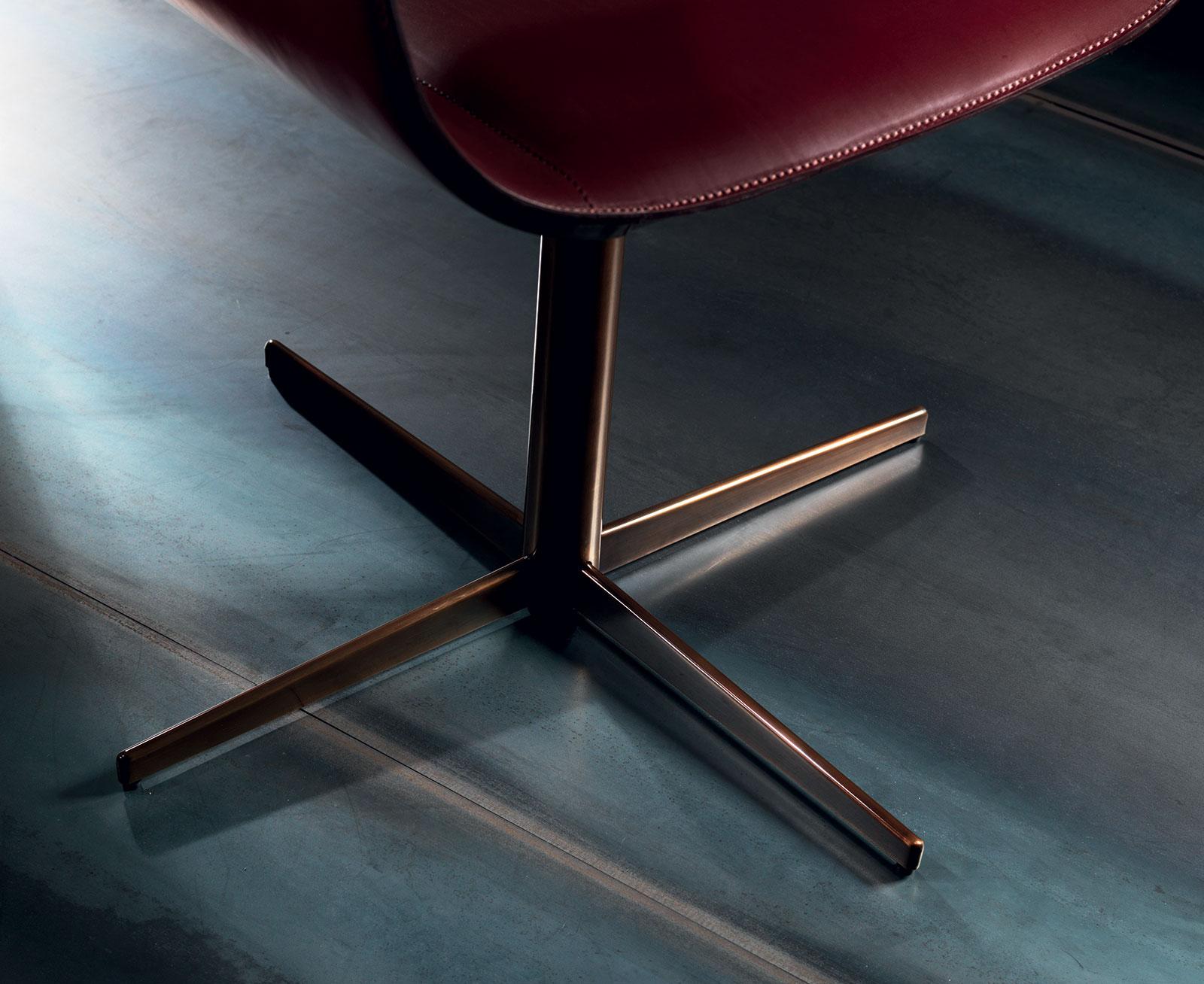 La seduta girevole è in acciaio e leggermente imbottita, rivestita in cuoio o pelle pieno fiore.