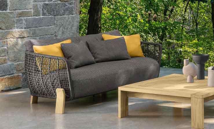 Il salotto da esterno è caratterizzato da un’avvolgente struttura intrecciata dalla forma scultorea che abbraccia le morbide sedute.