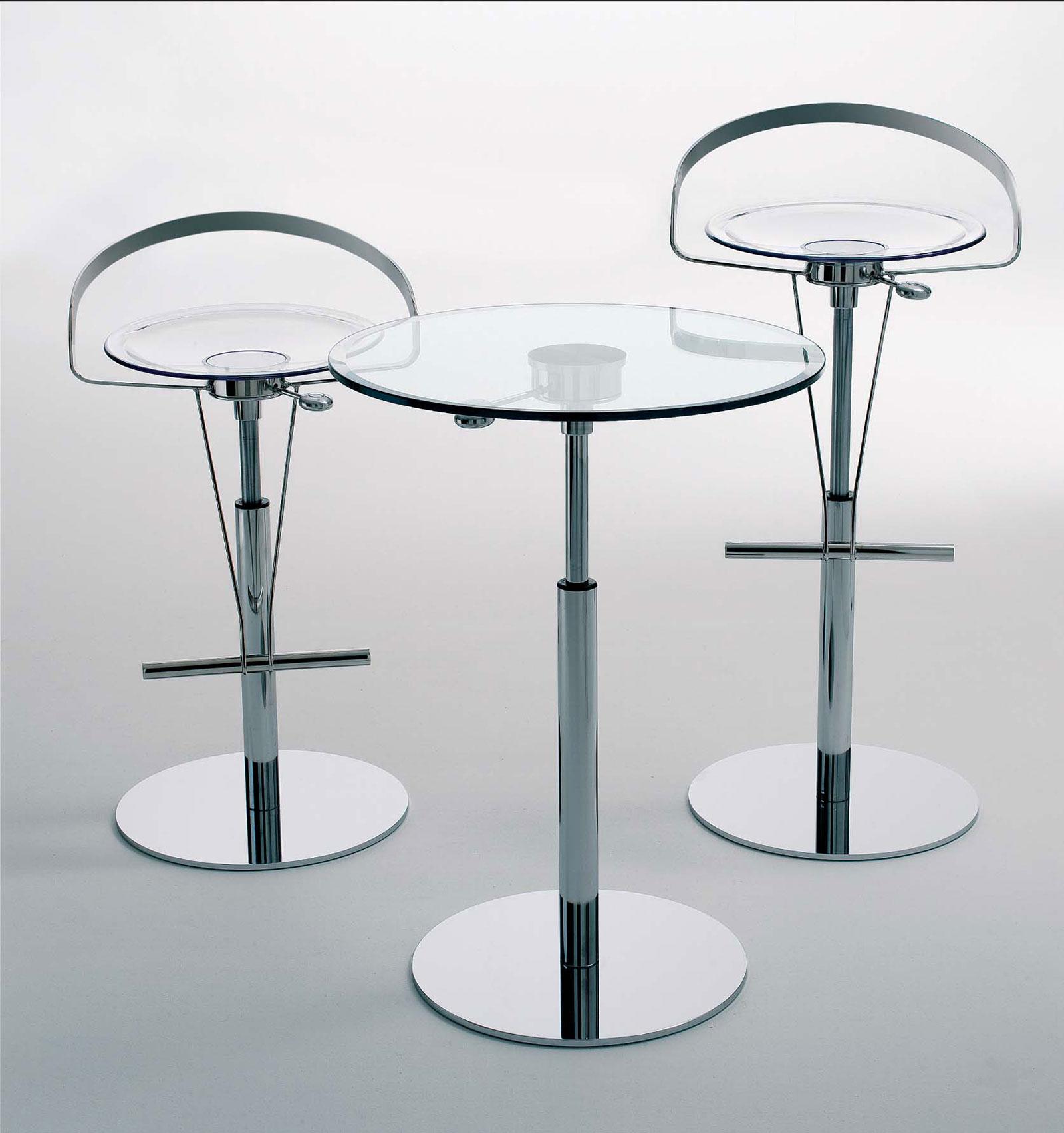 La seduta è in policarbonato trasparente ed è girevole. L’altezza della seduta è regolabile da cm. 60 a cm. 86. La trasparenza esalta il materiale e l’estetica della struttura e della base in acciaio.