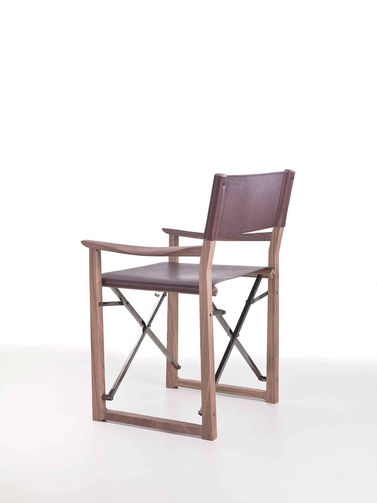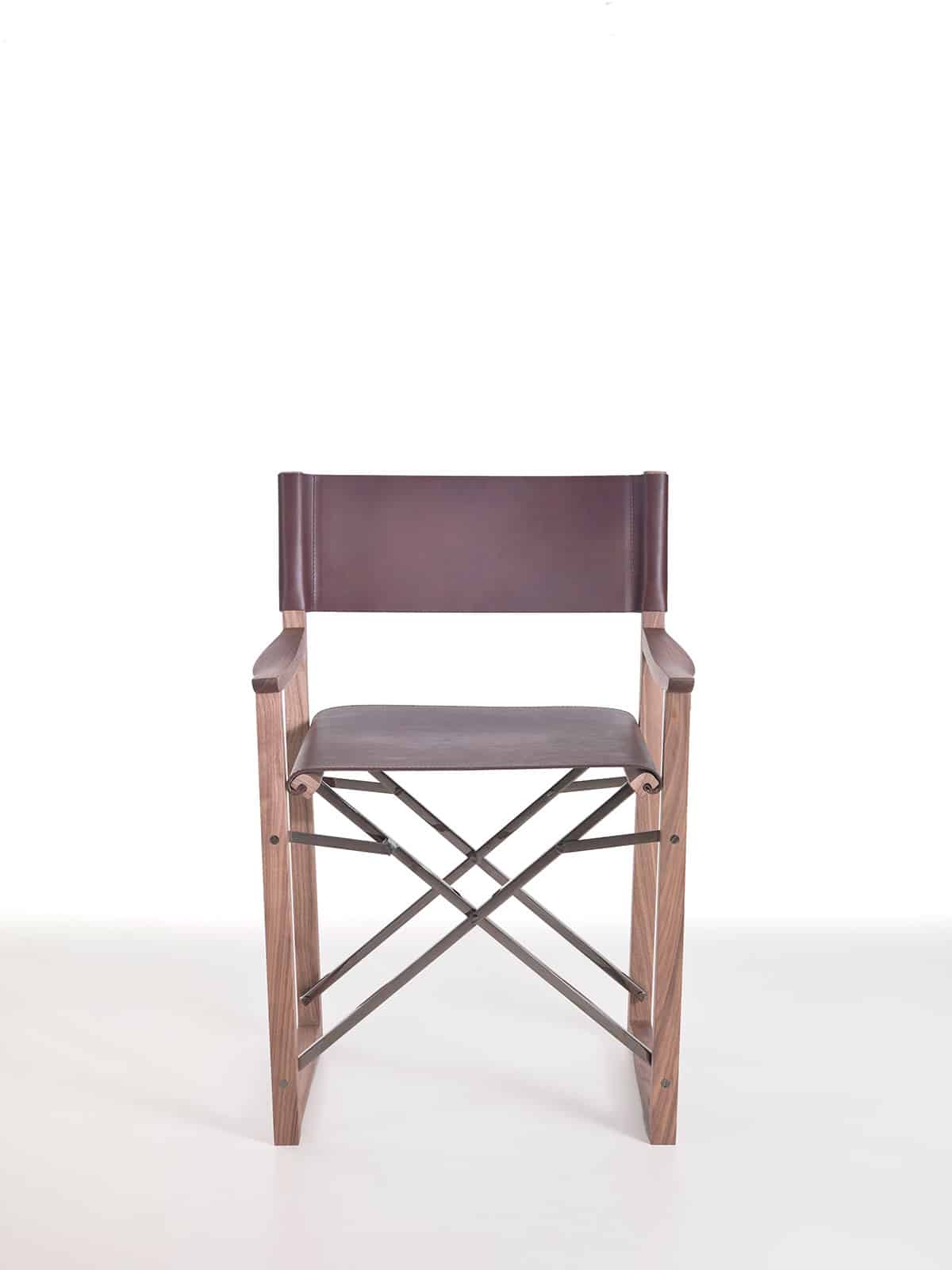 In questa versione la sedia da regista è reinterpretata in chiave lussuosa, esclusiva e inconsueta, grazie all’utilizzo di materiali nobili come il massello di noce canaletto, il pregiato cuoio pieno fiore e l’acciaio cromato con finitura nera.