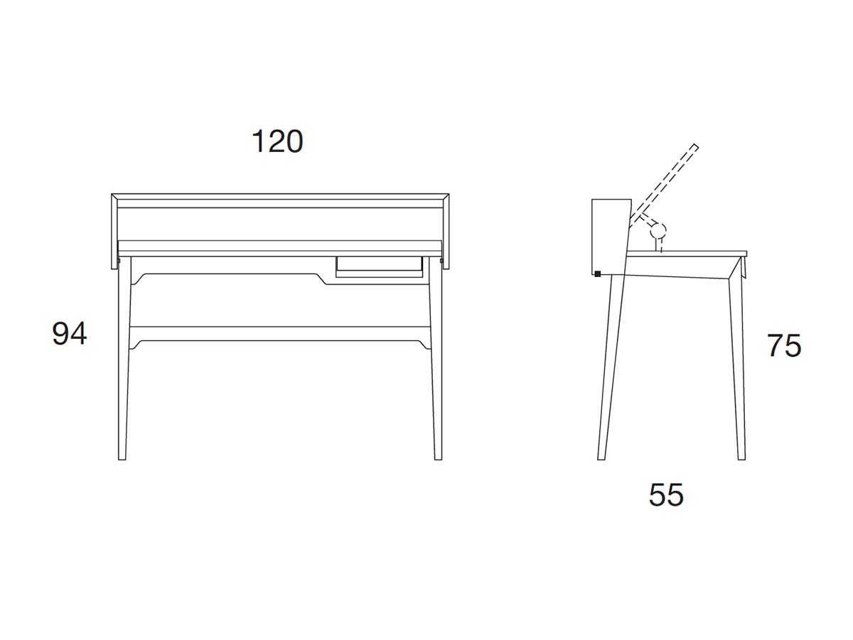 Le dimensioni contenute dello scrittoio (cm. 120 x 55 x h. 75/94) lo rendono adattabile anche dove non c’è molto spazio a disposizione.