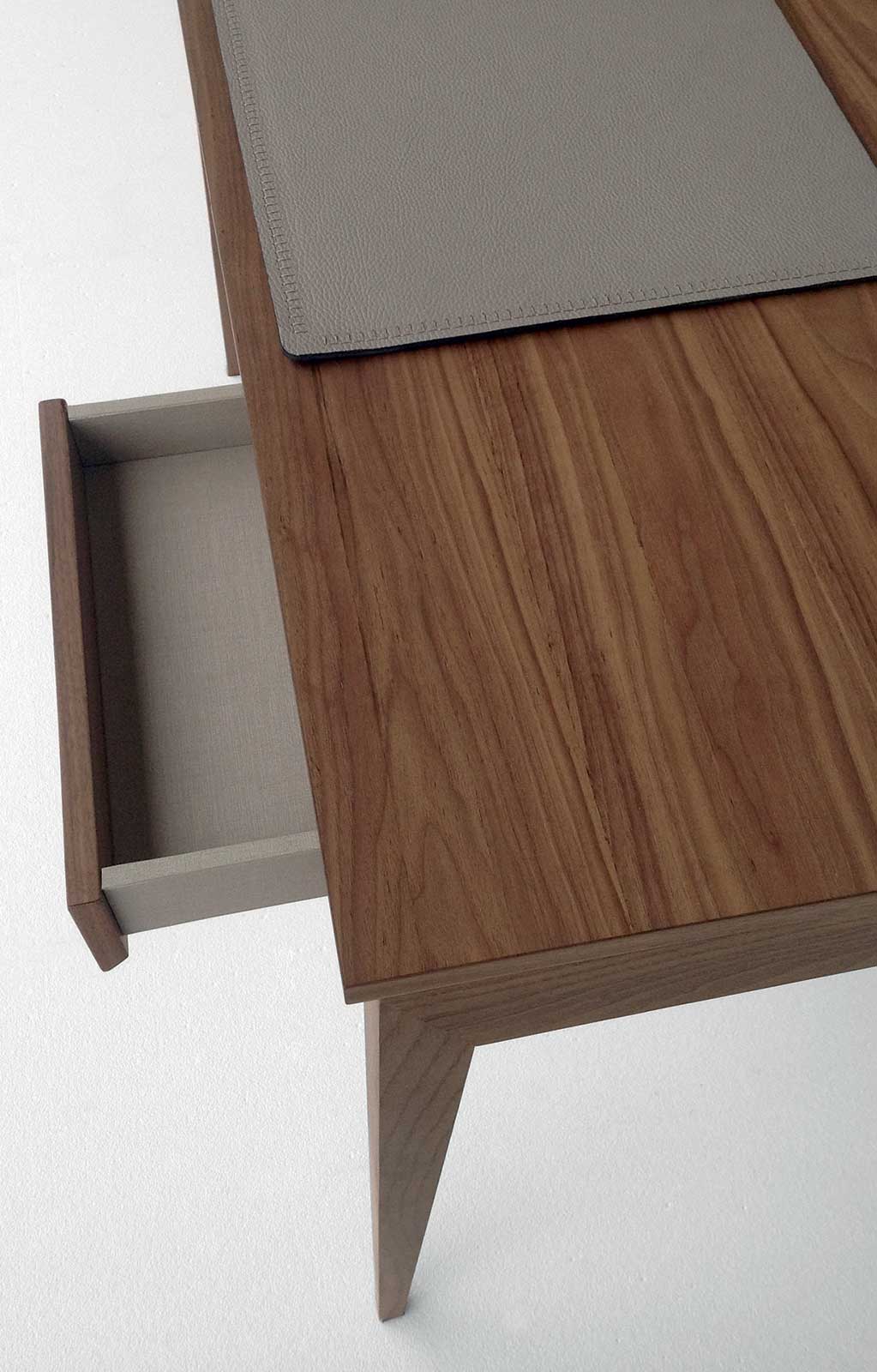 Lo scrittoio è di utilizzo molto pratico ed ha un ripiano apribile con pistone. È fornito con un sottomano in cuoio rigenerato color testa di moro, cuciture tono su tono.