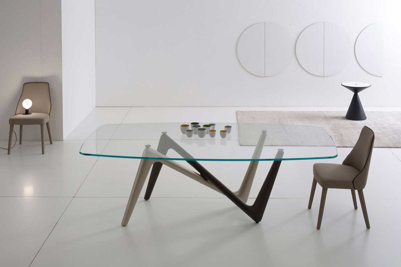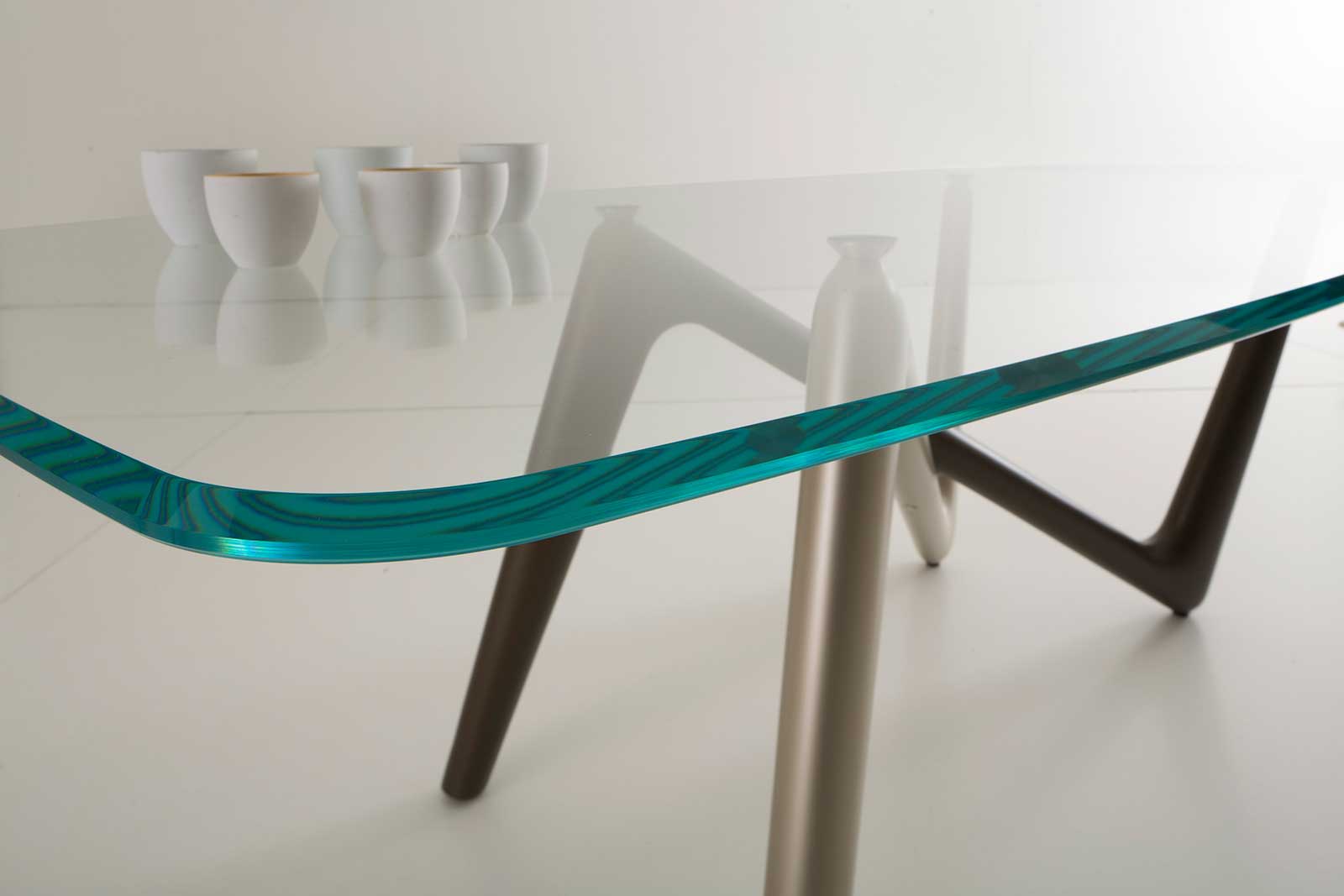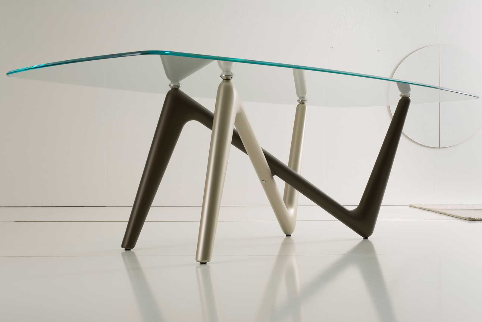 Grazie alla trasparenza del piano in vetro, il loro incrocio inedito si può ammirare in tutto il suo splendore.