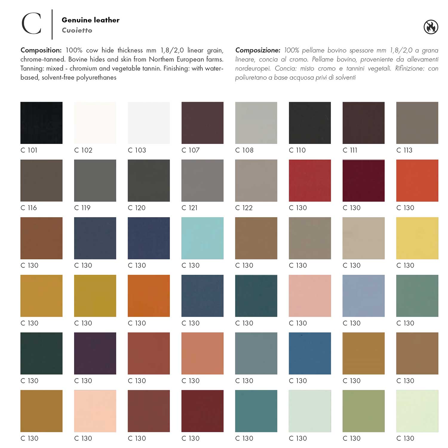 La pelle impiegata è il Cuoietto, una selezione di pelle dallo spessore di 1,8-2,0 mm, al 100% pellame bovino proveniente da allevamenti nordeuropei.