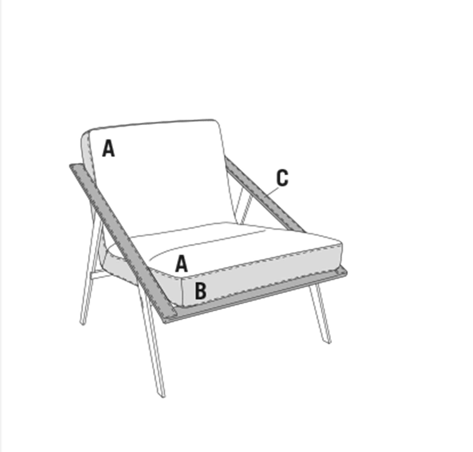 L’imbottitura della seduta e dello schienale è in poliuretano rivestito in falda.