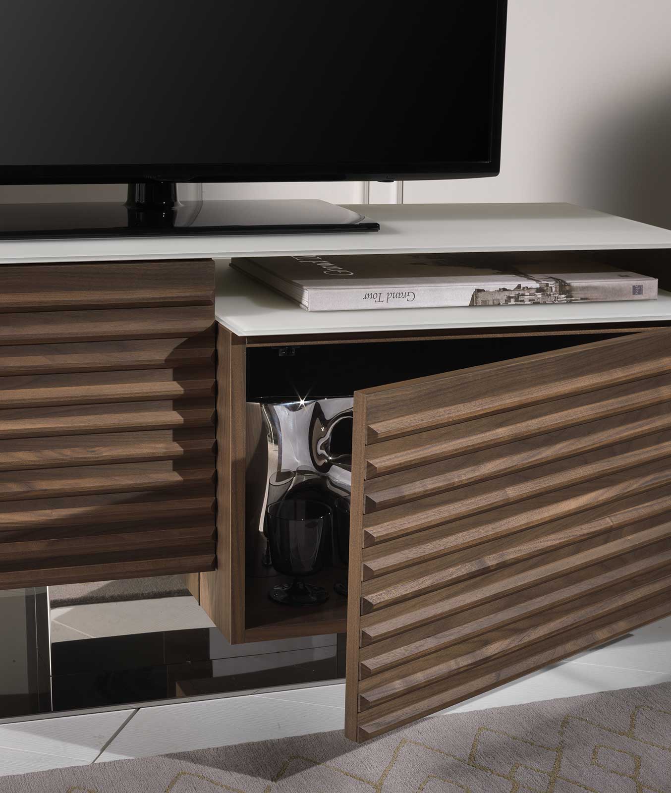 Designato dall’arch. Fabio Rebosio, FABIUS è un mobile porta Tv in massello di frassino con finitura tinto noce e top in vetro verniciato extra chiaro bianco.