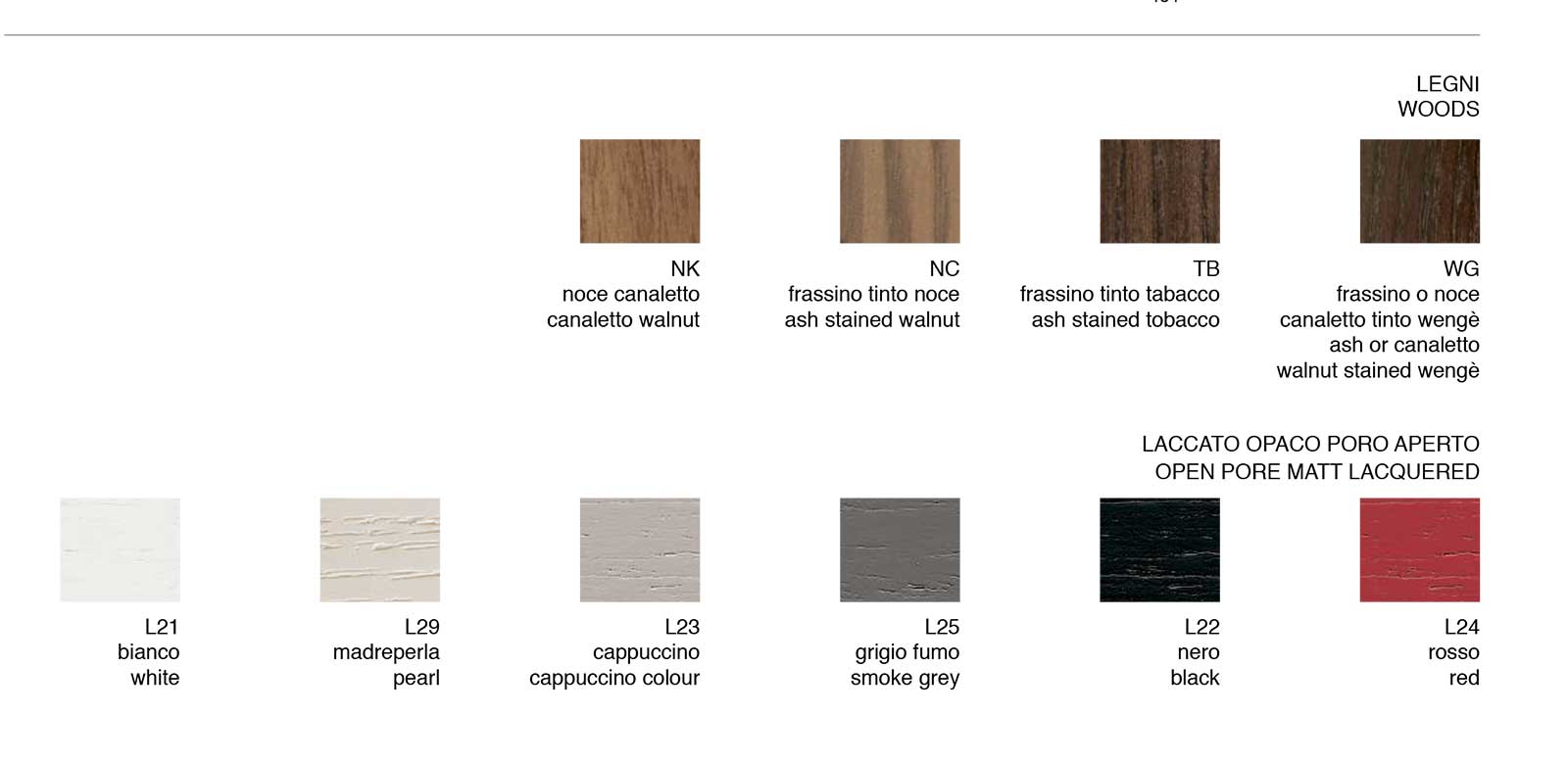 FABIUS è disponibile in opzione in altre finiture, come il top in vetro nei colori nero o moka e la struttura nelle finiture wengé, tabacco, noce Canaletto o laccata opaca a poro aperto in diversi colori (bianco, madreperla, cappuccino, grigio fumo, nero, rosso).