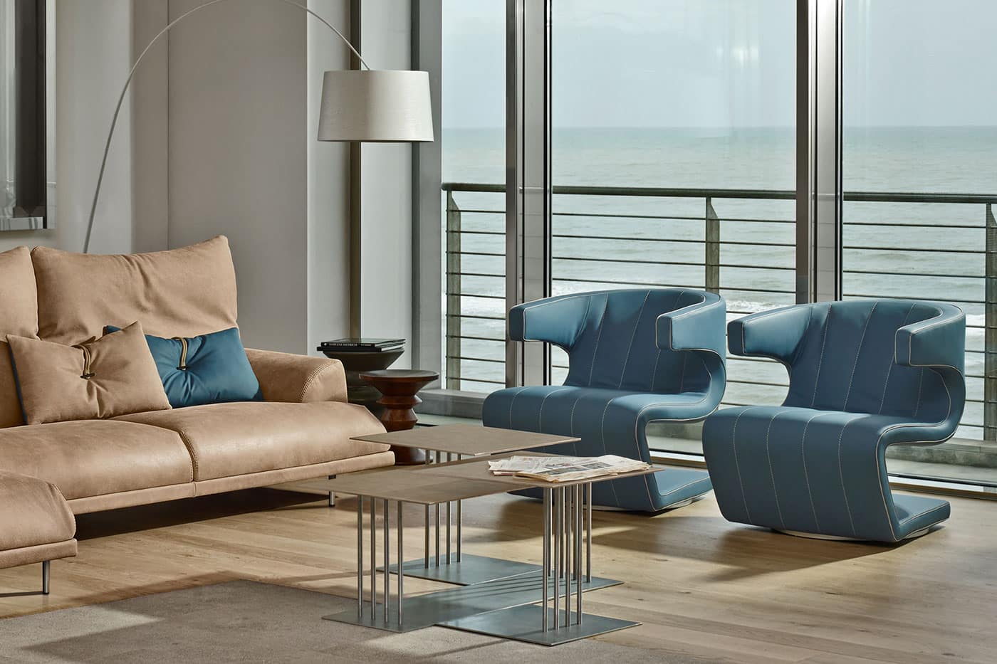 Qui la poltrona è proposta in un colore azzurro (codice Piuma E513).