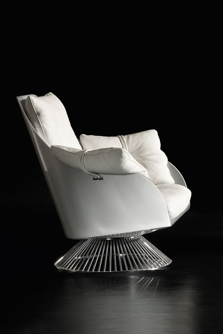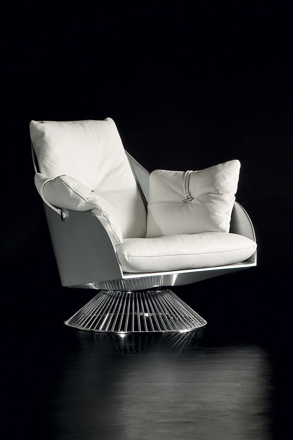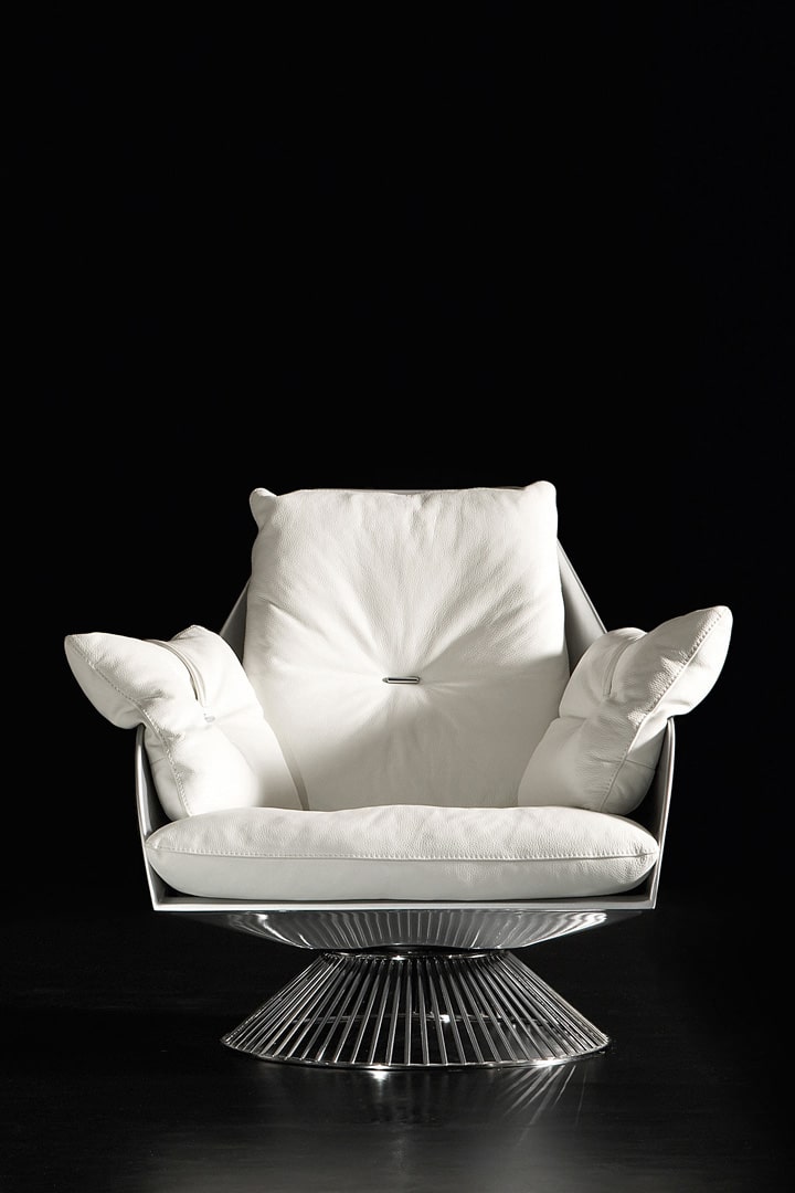 Gloss accoglie confortevolmente in una scocca dall’aspetto futuristico. I morbidi e raffinati cuscini esaltano in questa poltrona comodità ed eleganza. La base rotonda a raggiera, solida e stilisticamente leggera allo stesso tempo, è un dettaglio unico e originale.