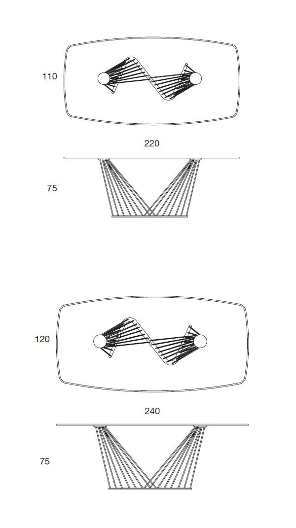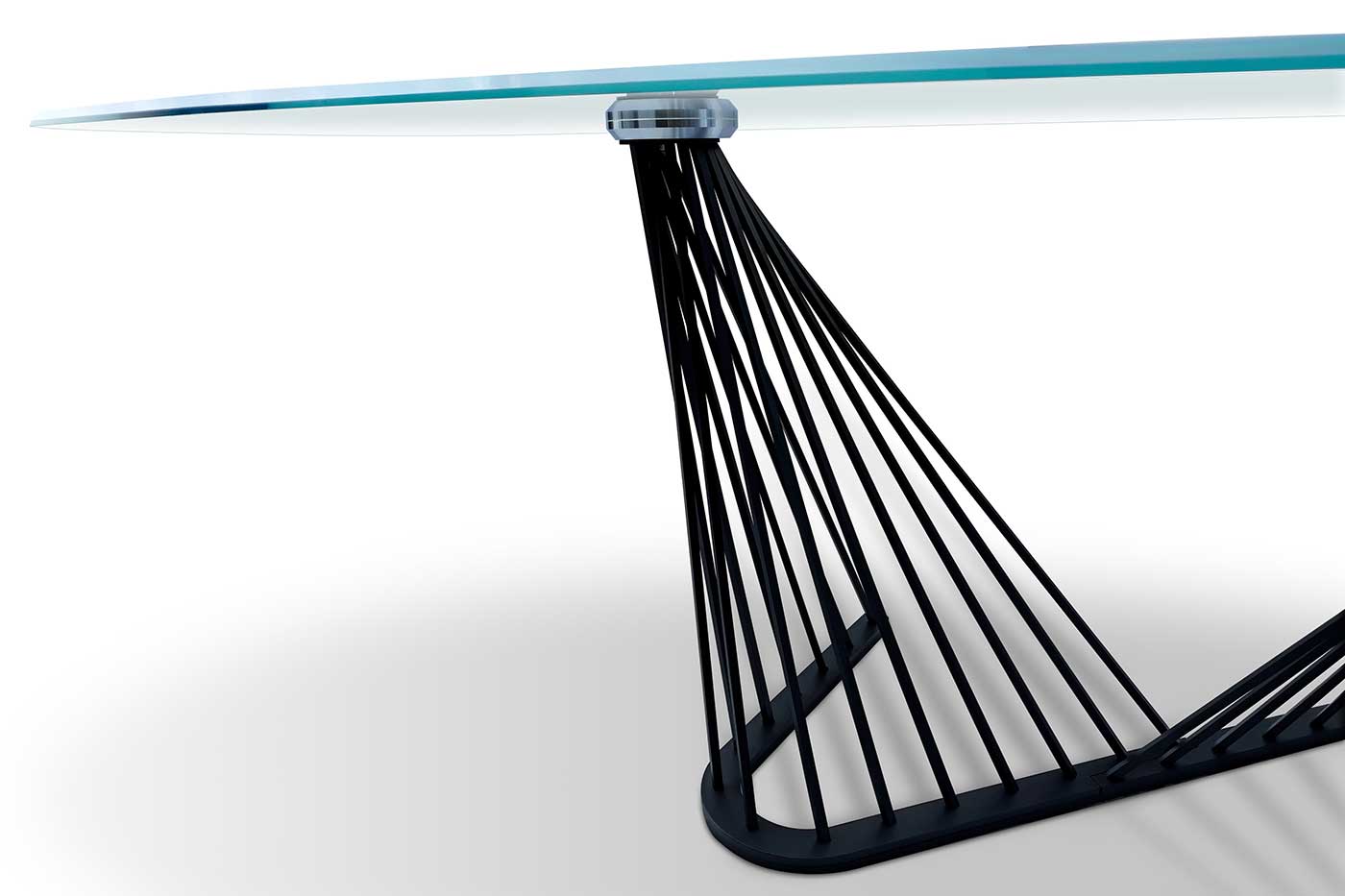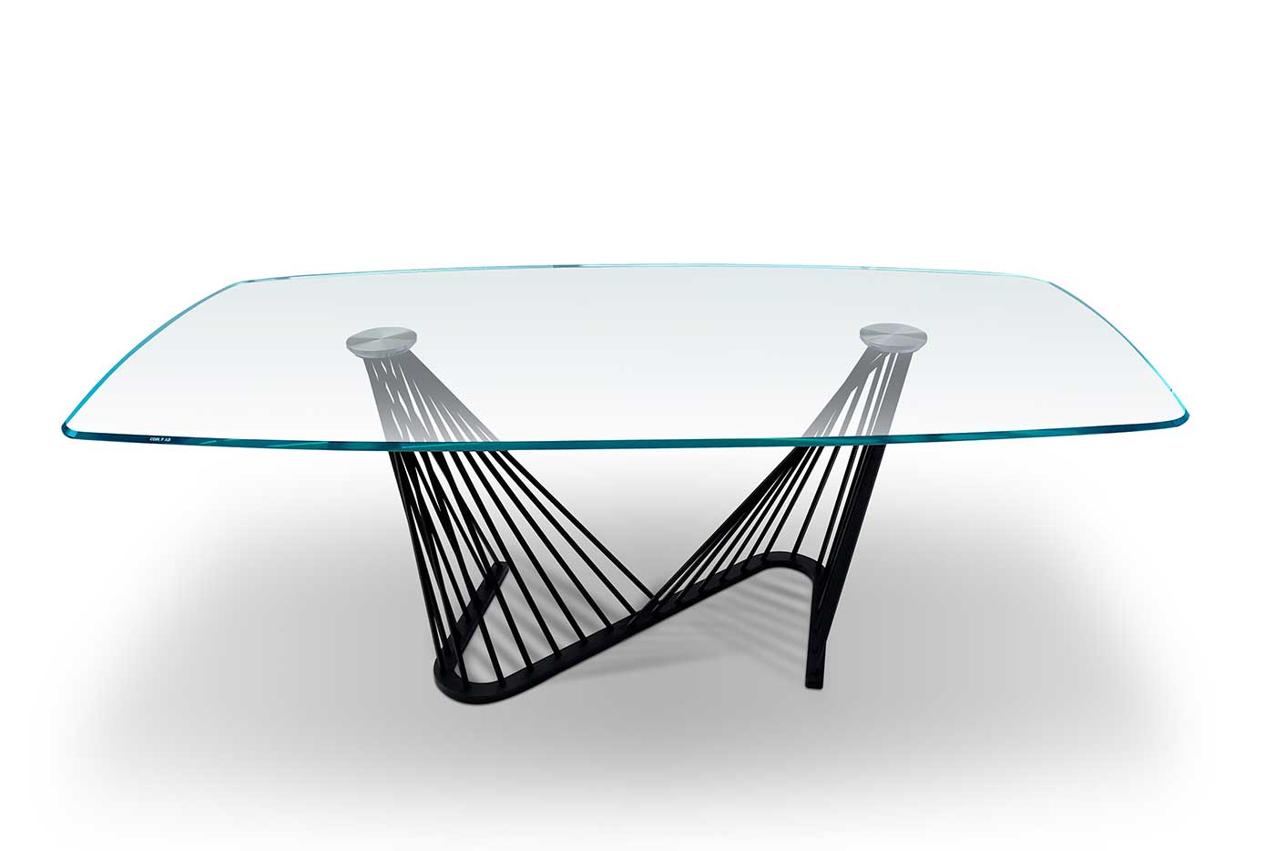 Harp è un tavolo con piano in vetro sagomato a botte.