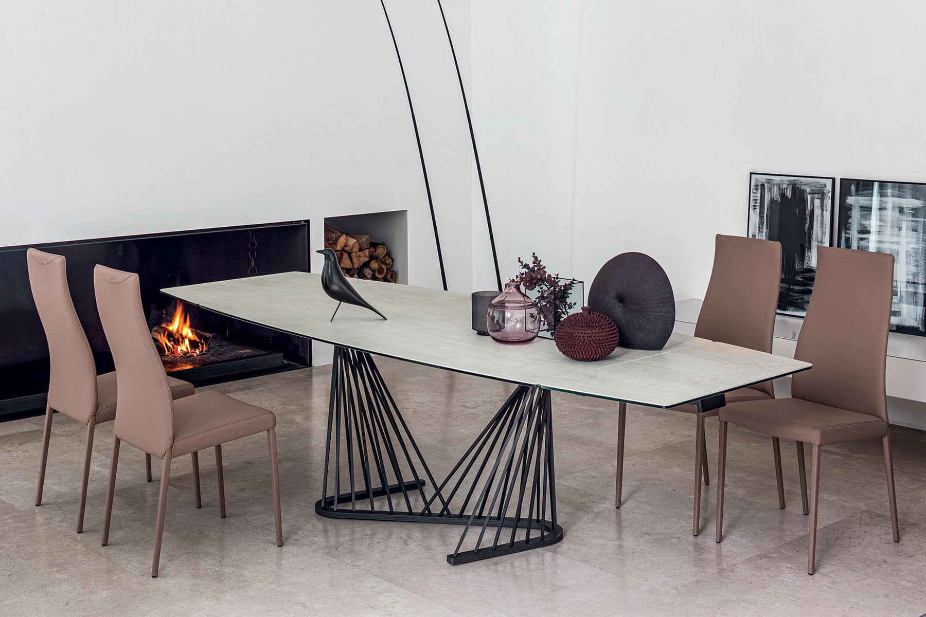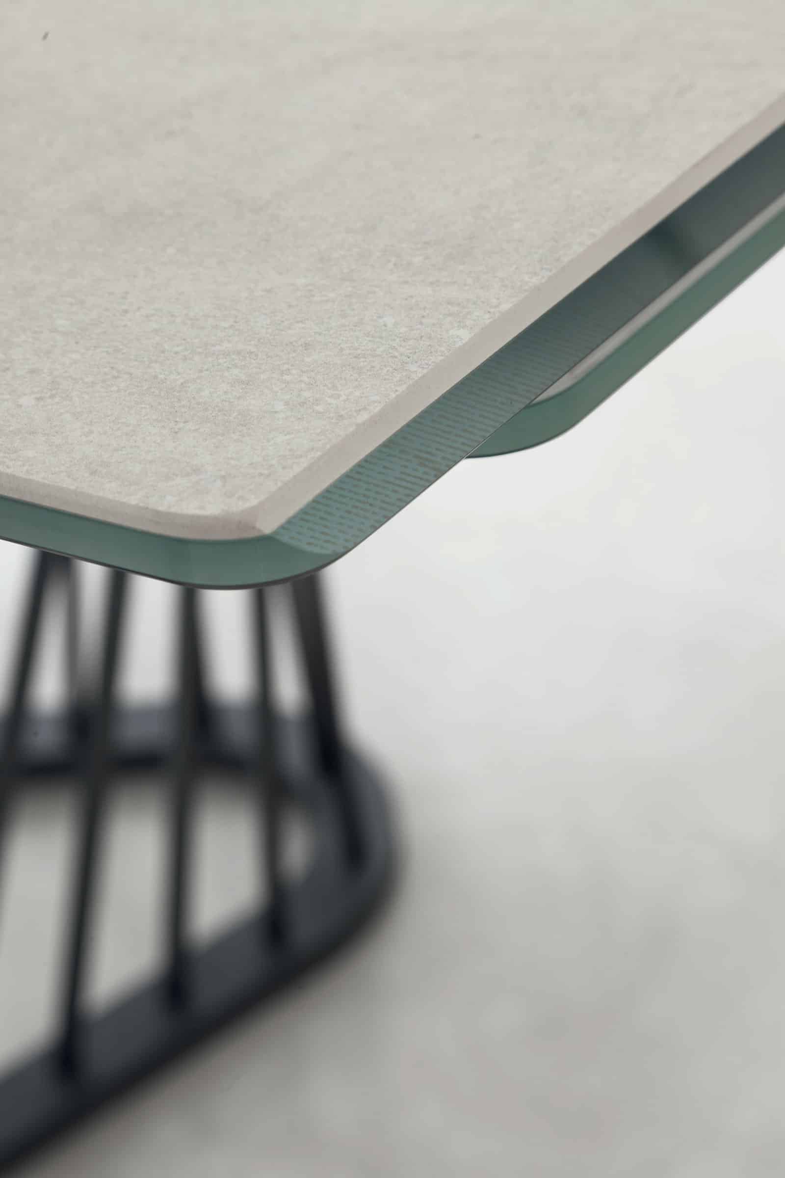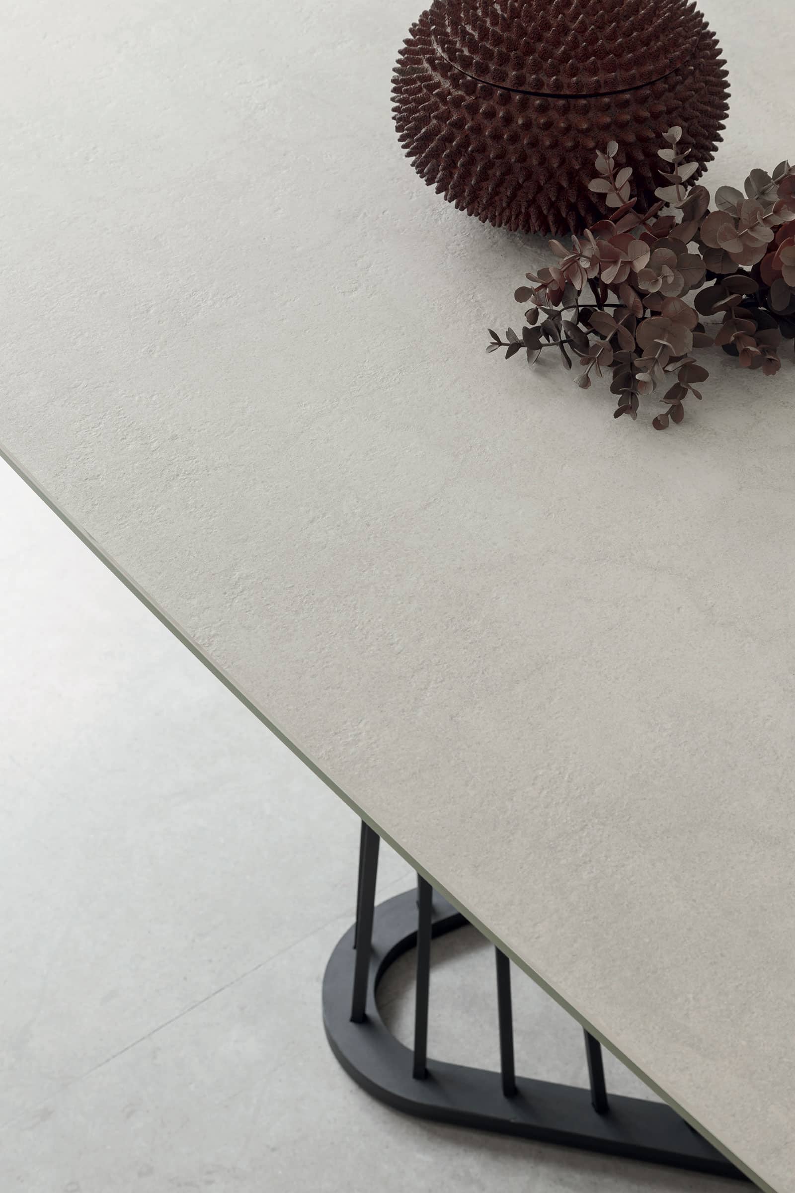 Il piano del tavolo è qui proposto in una elegante versione in ceramica “K12 – Pietra di Savoia Perla”.
