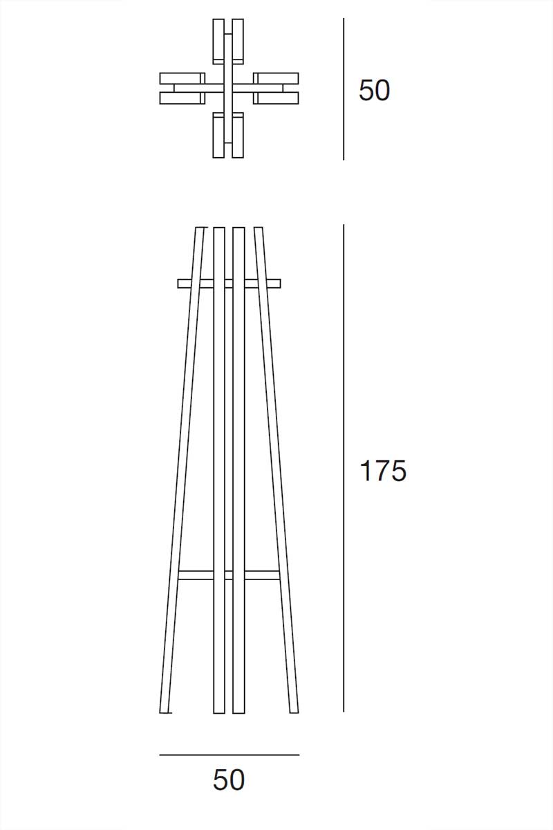 La sua forma è definita da otto barre verticali in legno che tendono a ricongiungersi verso l’alto, creando un movimento dinamico e armonioso. Due elementi strutturali disposti a croce collegano e stabilizzano l’intera composizione, garantendo equilibrio e solidità senza compromettere la leggerezza visiva.