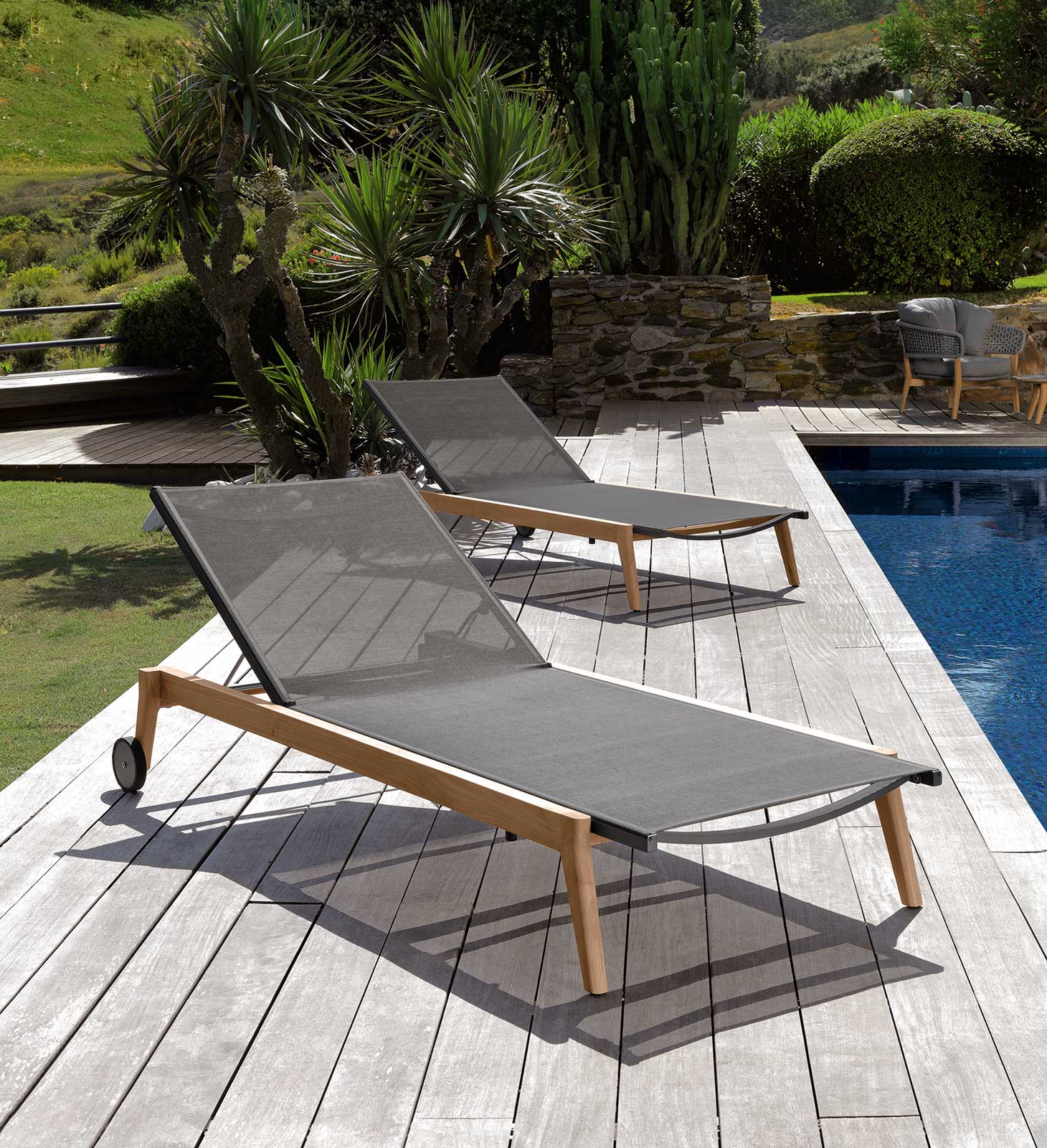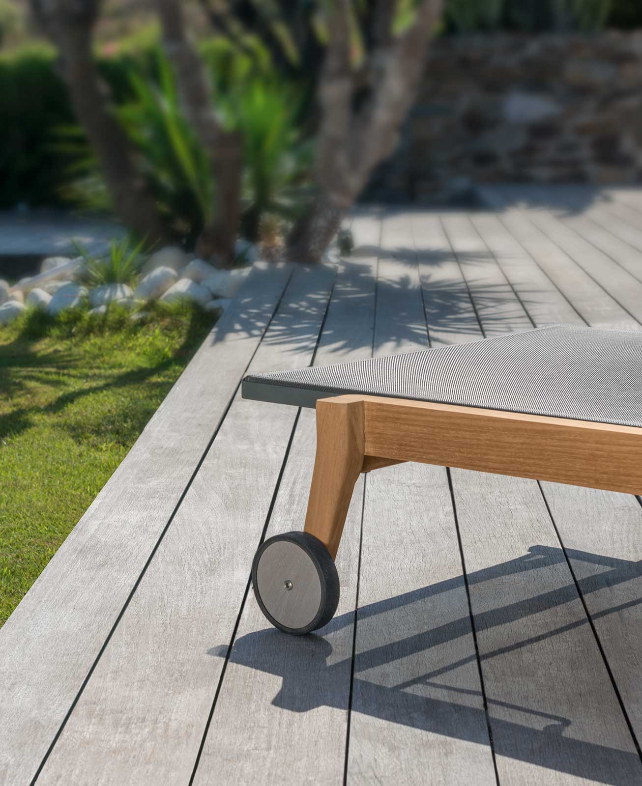 La seduta è in textilene grigio. E’ dotato di ruote per uno spostamento facile. Le ruote e cremagliere sono in acciaio inox. La struttura è in teak naturale.Tutti i materiali sono adatti per resistere agli agenti atmosferici.